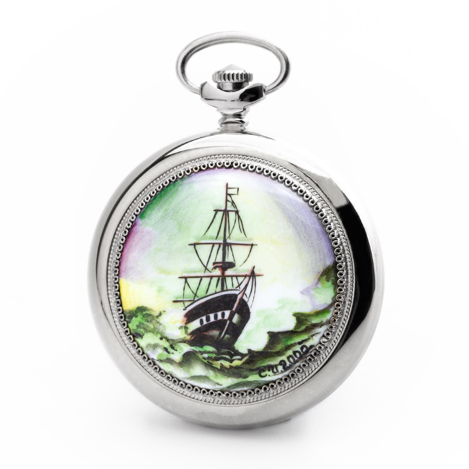 Russische mechanische Taschenuhr Marke MOLNIJA mit dem Schiff - handbemalt