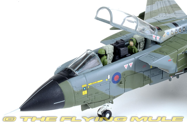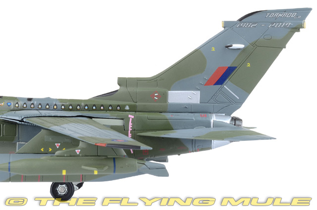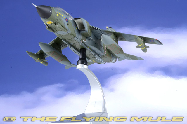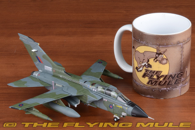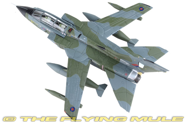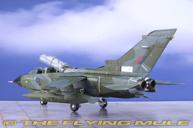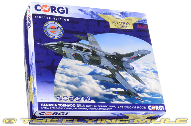 In the year which followed commemorations to mark the centenary of the Royal Air Force, one of the most important aircraft since the end of the Second World War was finally withdrawn from service, after providing the backbone of Britain's aerial strike capability for almost 40 years. Indeed, as if to underline the effectiveness of this magnificent aircraft, eight aircraft which had been on overseas deployment at RAF Akrotiri, only returned to Marham in the days leading up to the aircraft's retirement. Thankfully, RAF personnel who were privileged to be the final custodians of the Tornado in the final days of its service career were in no mood to let the aircraft slip away quietly and ensured that the "Mighty Fin" enjoyed a send-off befitting an aircraft of this stature. Three aircraft were presented in special schemes to mark the end of RAF Tornado operations, including GR.4 ZG752, which was given a striking wrap around retro camouflage scheme, similar to the markings applied to the first RAF GR.1 Tornado aircraft which entered service back in 1982. The tail of the aircraft carries the markings "Tornado GR 1982 - 2009" and its spine proudly displays all the badges of the RAF squadrons, reserve units and training establishments which operated the Tornado during a service career which lasted almost 40 years. As the RAF said farewell to their most effective strike jet, RAF Marham ensured that its impressive service legacy was commemorated in some style. Panavia Tornado GR.Mk 4Designed in collaboration with Britain, West Germany and Italy, the Tornado was first flown on August 14th, 1974 and is thought by many to be the most important military aircraft in Western European history. Nicknamed "The Flying Fin" because of its large tail fin, the Tornado has a variable wing sweep design and is capable of taking off and landing on short airstrips. It is equipped with terrain-following radar, which allows for hands-off, low-level flight in any weather. There are three primary versions: an electronic combat/reconnaissance version, an interceptor and a highly versatile strike fighter-bomber capable of carrying almost all of NATO's air-launched weapons.© Copyright 2003-2026 The Flying Mule, Inc. Corgi's 1:72 scale Tornados feature the distinctively large tail fin that gives the real aircraft its nickname, "The Fin". The models also incorporates an articulating swing-wing design that can be configured in varying sweep positions, movable elevators that rotate in unison, and simulated stainless-steel heat shielding around the detailed engine exhaust. The wing mounted fuel tanks and ordnance can be positioned to fit any swept-wing configuration, and the repositionable canopy opens to reveal pilot figures and cockpit detail, including the distinctive embedded cordite charge used to shatter the canopy during the ejection sequence. The mold itself is exceptionally rich in detail, with every access panel and antenna faithfully reproduced. Pad-printed unit markings and placards provide the finishing touches. © Copyright 2003-2026 The Flying Mule, Inc. Corgi Aviation Archive Collector SeriesThe Corgi "Aviation Archive" range presents highly-detailed, ready-made diecast models of military and civilian aircraft. The vast Aviation Archive range has become the standard by which all other diecast airplane ranges are judged. Each Corgi model is based on a specific aircraft from an important historical or modern era of flight, and has been authentically detailed from original documents and archival library material. Famous airplanes and aviators from both military and commercial airline aviation are all honored.Corgi "Aviation Archive" diecast airplanes feature:
