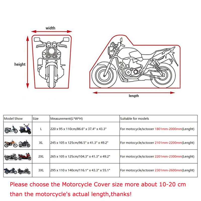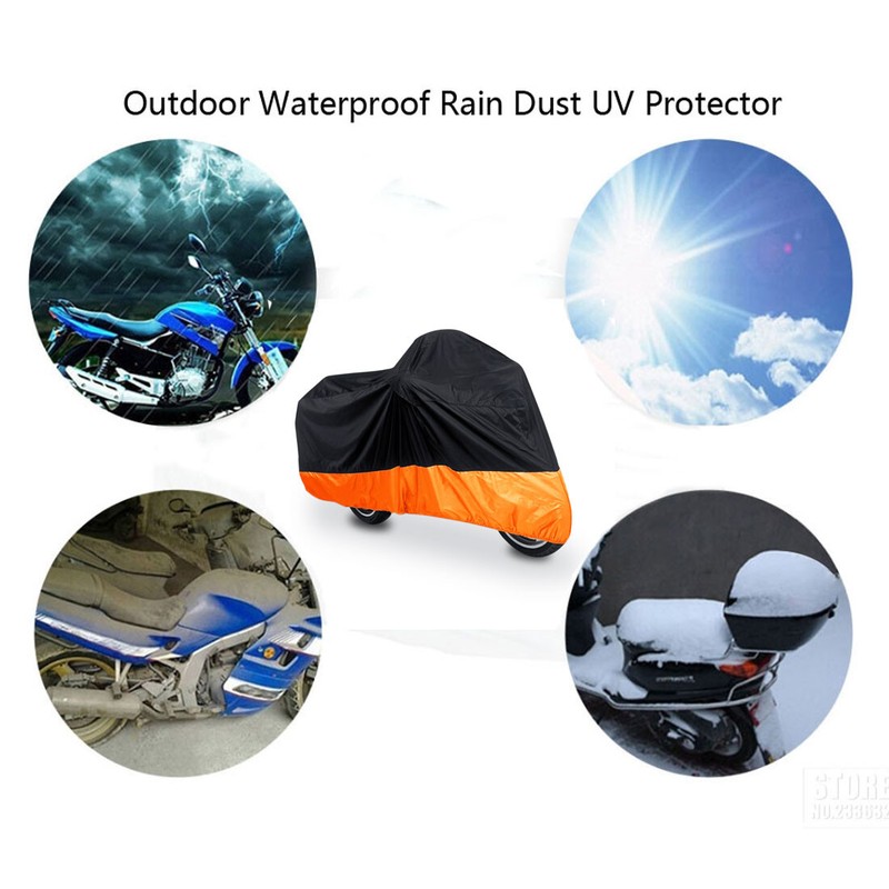 - Installation:Very easy, directly open the Motorcycle Cover to cover your Motorcycle (With tighten strap!) Specifications: Material: 190T Polyester Taffeta Fabric + PU Coating Color: Black + Orange UV: 50+ Size: XXL-265x105x125cm/ 104.33x41.34x49.21" (We sell the size from L to XXXL, if you want to purchase the other sizes, pls contact to us.) Note: Compatibility is only for Reference, PLS Check Your Motorcycle Size Before Purchase. Choose the Motorcycle Cover size more about 10-20 cm than the motorcycle's actual length. Package included: 1 x Motorcycle Cover