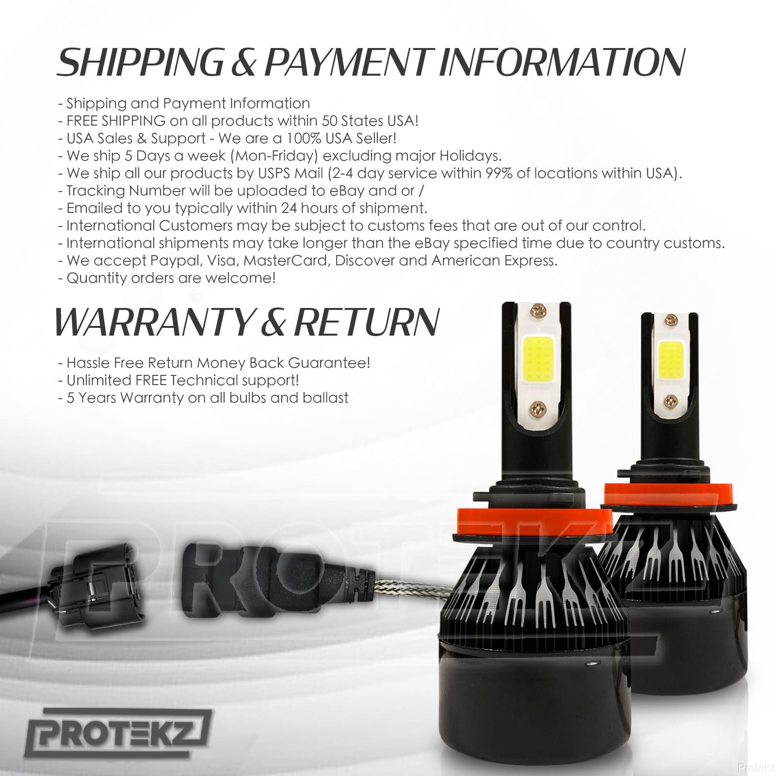 Product Description Please Note: Compatible List can not show up all car model, Please make sure you car plug before you purchase If you are unsure your bulb type, please do remember send message to tell us your car make, model, year and other information which is helpful to check bulb type. for example: 2017 Toyota C-HR, high/low beam 2015 RAM 1500 with projector-type, high beam Description: ★ Compatible With: H1 H3 H4 H7 H8 H9 H10 H11 H13 9004 9005 9006 9007 880 9012 5202 LED Halogen replacement Bulbs ★ Color: 6000K(Pure White Color) ★ Condition: 100%Brand New/ Never Used ★ Need additional Parts or Modification? 100% Integrated Design, Plug and Play. (Few vehicles may require load resistors to stop flickering or fix error message) ★ Package include: 2x LED Headlight Bulbs ( Built-in Driver Ballast ) FREQUENTLY ASKED QUESTIONS OF LED 1.both side could not work? please turn around the plug (swap the polarity) and try again 2.One side could not work? 1)please turn around the plug (swap the polarity) of the defective bulb and try again 2)please exchange the bulbs from side to side and see if the problem could solve 3)Please check your connection and fuse 4)If still could not help, please contact our customer service, we will get back to you within 24 working hours 3.both side flicker/interference/error light? Pls kindly noted that your car need a resistor Cancelers Decoders, you can contact our customer service for help 4.My bulb type is H7, but the one you sent could not fit? Pls kindly noted that your car need a bulb holder to lock the bulb, you can get one from ebay according to you vehicle model 5.My bulb type is H1, but there is only one clip on my bulb and the one you sent has two clip Pls kindly noted that different cars have different connection way, which some have both positive and negative electrode, while some just have positive electrode but not negative. if there is just positive electrode but not negative, please connect the positive side, as for the negative wire, please connect to the car's metal shell. 6.the bulbs is loss and it could not fit(H8/H9/H11/9005) Please put the bulb in the bulb assembly, and make sure to rotate the bulbs in the socket by clockwise, only by this way can install the bulbs, if you just put it in the socket, cannot stable the bulbs. 7.the bottom of the bulb is too big and it could not fit For some special cars, you need to make a hole on the waterproof/dust cover and let the fans come out, and in this way will solve the radiating problem. If the problem you meet is not on above or the answers cannot solve the problem, please feel free to contact us through eBay message, we will try our best to help you solve the problem and definitely won’t let your interests to be damaged. So anything please keep in touch first, I believe that everything could be solved by communication. Brand New ★ Product Advantages ★ High brightness ★ High temperature resistant ★ High purity of luminescence ★ Good stable performance ★ Instant on fast cooling ★ Energy saving environmental ★ Long lifespan(>50000hr) ★ Interchange Part Number: Use for high Beam, Low Beam, DRL or Fog Lights… ★ LED Type: 2Pcs Led Chips Each Bulb ★ Other Part Number: 6000K(Xenon HID Pure White) Head Light Lamp Bulbs ★ Beam Angle: 360 Degrees ★ Placement on Vehicle: Left, Right, Front ★ Heat Control: Aluminum shell base including Turbo cool fan ★ Warranty: Yes ★ The latest design of the led headlight , whose luminous point is the same as the factory light, thus beam Pattern is flawless. The compatibility table is only for reference, please make sure to verify the bulb type of your vehicle before purchasing. We are happy to help if you need any further information. Features: 1.Each Bulb have 2 sides of Super Bright LED Chips 2.Complete Kit: No Other Ballast/Driver Required Just Plug and Play - Newest Technology 3.Beam Angel: 360 Degrees 4.Color Temperature: 6000K Pure White 5.Smart Efficient Cooling System, Built-In Cooling Fans For Fast Heat Dissipation 6.High quality Aluminum heat dissipation ensures the secure temperature range 7.Low Power Consumption than Halogen bulb or Hid Kit, Energy Saving 8.Low Voltage Protection, High Precision Constant Current driver Chip 9.Shakeproof and Long lasting up to 50,000 Hours. 10.Easy installation, Plug and Play, NO modification required 11.Operating Temperature: -40°C ~ +80°C Automotive LED Headlamps Advantages: 1. LED lights than traditional halogen energy, more power. 2. Xenon lamp brightness and proximity, but the LED lights light up without delay, to enhance road safety. Instant start no strong currents impact, effectively protecting the car comes with a battery, improving battery life of more than 30%. 3. Fast cooling , the appearance of the most advanced design , thermal structure ingenious and reasonable. Less warranty, power driver with wide voltage constant current mode, the car can respond to a variety of voltage instability , the effective protection of normal use Led efficient and simple structure . Fewer Components damaged, repair the probability is very low , compared with HID ballast repair lower than 80% . 4. Heating temperature is low , protect the car . Xenon working temperature up to 800 ° -1000 ° , the main reason for the car ignition . 5. LED car headlights simple structure, fewer parts than xenon lamps, significantly lower than the xenon lamp failure rates ! 6. Automotive LED headlamps color temperature balancing. The Xenon bulbs in the same color to clear , about 6000K. Install Caution 1. As a safety precaution, make sure that the car has had time to cool down properly before starting the installation process. 2. Put the vehicle into park or make sure it is securely in gear. 3. Make sure to have the ignition turned off and the keys removed. 4. Be careful to avoid burns, especially when turning on or off the vehicles lighting. 5. Be careful to avoid crushing or cutting the bulbs. Also make su