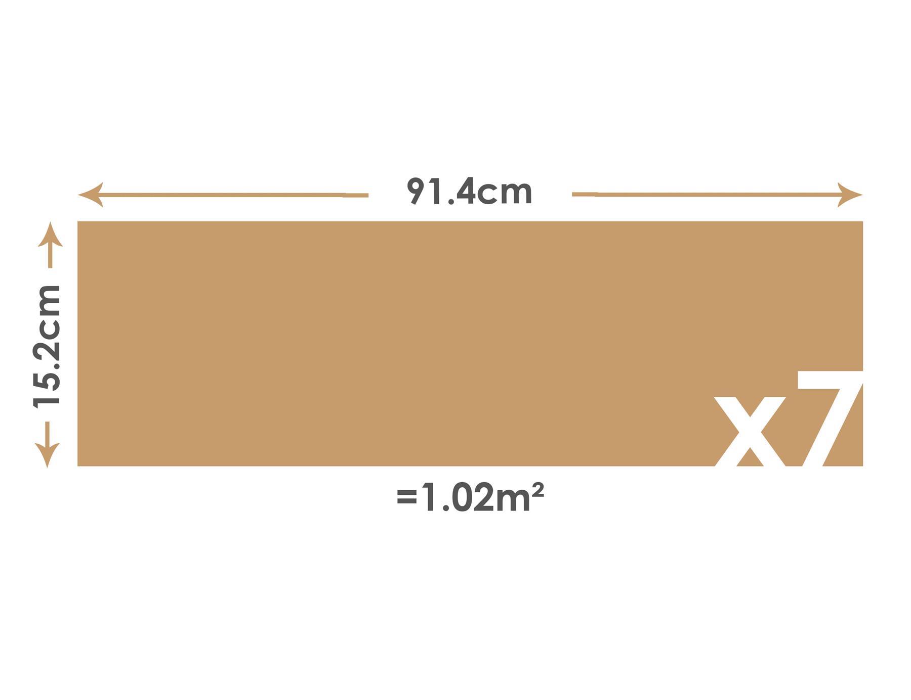 SIZE: Each plank measures approximately 15.2cm x 91.4 cm. The planks come in packs of 7 and 1 pack is designed to cover approximately 10.9ft². You can purchase these in various pack sizes to cover any surface area you have. We would advise when measuring to add an extra 10% on top of the ft² needed to allow for any cuts needed.