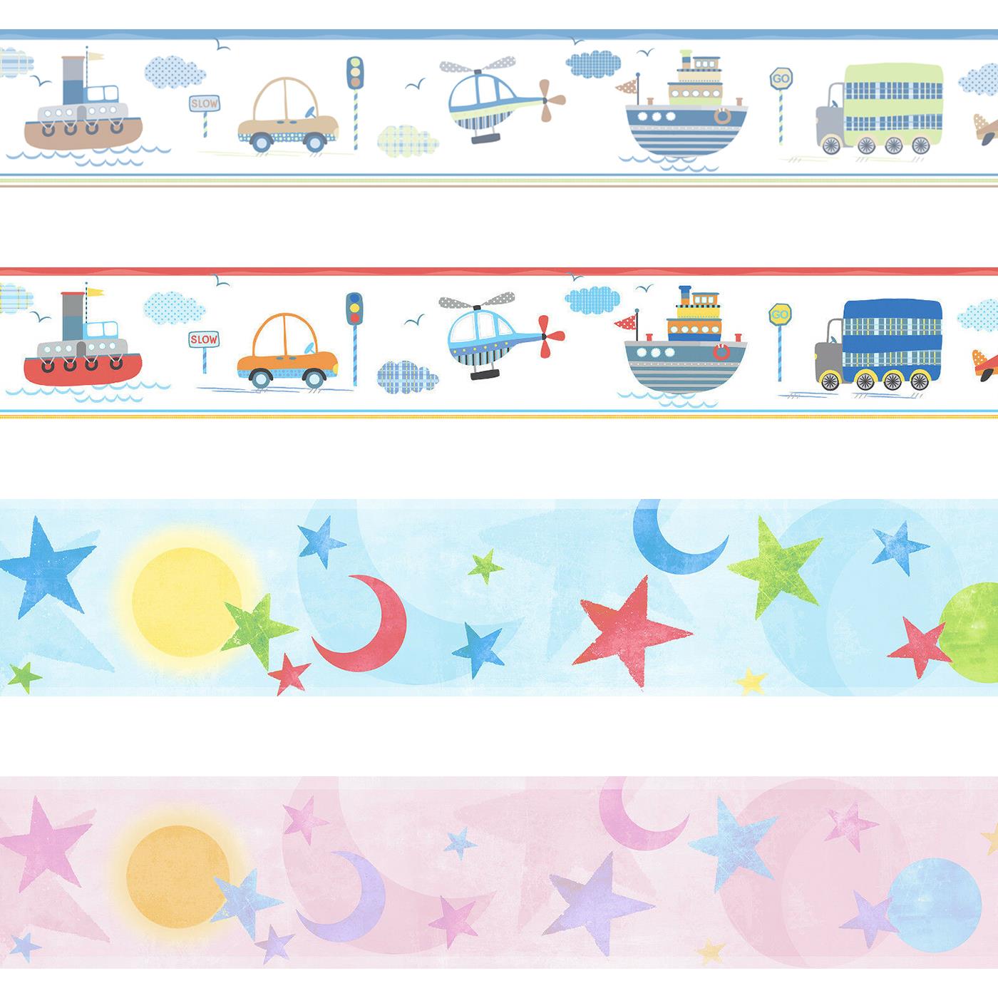 Allow Galerie's Tiny Tots range to transform your child's bedroom or nursery into a fun and friendly space with these vibrant wallpaper borders. Choose between the exciting vehicles design with boats, cars and planes throughout, or the calming night time design with moons and stars in smooth pastel colours. Both designs are available in either blue or pink/red colour ways.