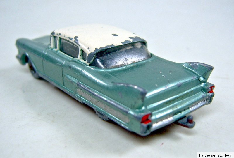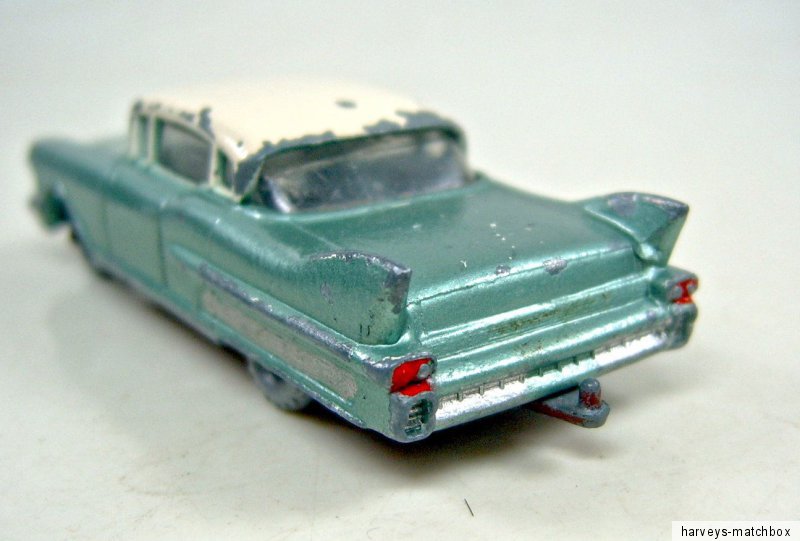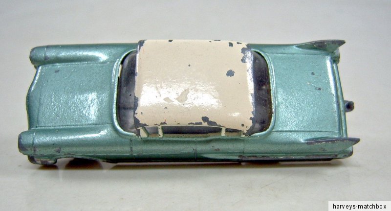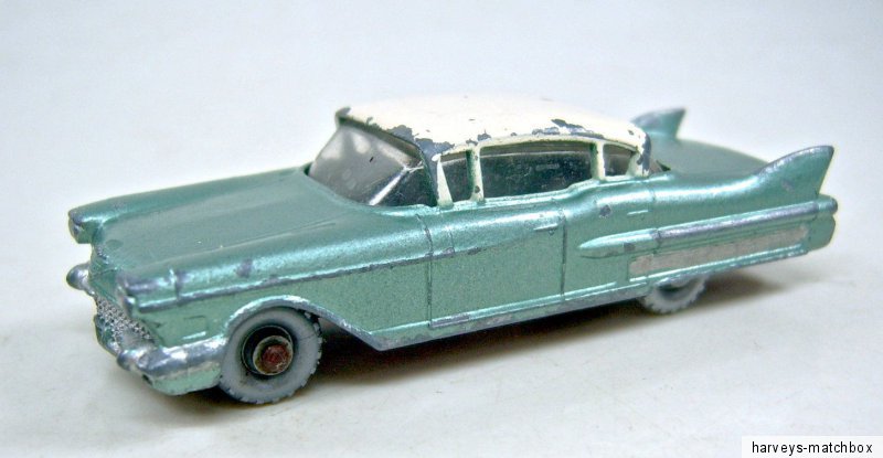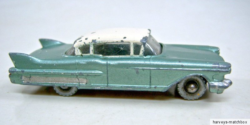 Willkommen bei den Ebay Angeboten von Harveys-Matchbox! Sie sammeln Matchbox Modelle? Dann klicken Sie links auf die gewünschte Shop Kategorie oder beginnen mit der Startseite. Mehr als tausend Modelle und Zubehör erwarten Sie! Alle jene Sammler welchen meinen Onlineshop kennen werden die Struktur der Artikelgruppen hier im Ebay Shop erkennen, ich versuche alle Angebote in möglichst aussagekräftigen Kategorien zusammen zu fassen. Da niemand alles von Matchbox sammelt sind die einzelnen Hauptsammelgebiete wie Regular Wheels, Lesney Superfast aus England oder Superfast aus Fernost Produktion getrennt und dann noch nach den Nebenlinien aufgeschlüsselt. Wenn Sie genau wissen nach welchen Modellen Sie suchen benutzen Sie bitte die Suchfunktion. Es sind nicht alle Modelle aus meinem Onlineshop hier bei Ebay gelistet, sollten Sie hier nicht fündig werden schauen Sie mal dort nach. Mehr Informationen finden Sie auf der mich Seite! Hier biete ich an Matchbox 1-75 Regular Wheel Serie 1953 - 1969 ohne Box No. 27C Cadillac Sixty Special Seltene 1. Ausführung in grünmetallic, cremefarbenes Dach, klare