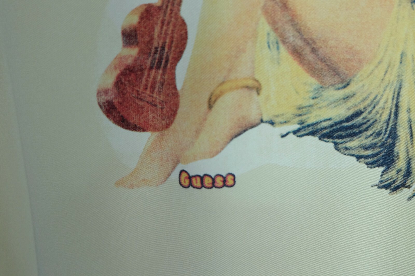 Awesome vintage GUESS Jeans twill rayon men's aloha hawaiian shirt with hula girls printed on yellow background. The shirt is pre-owned still in good condition, but the shirt has pin holes on front near collar and back hem, one dot on left sleeve. Please see photos. It has been laundered clean and fresh ready to wear. It has hawaii collar, single pocket with embroidered logo on left chest and patch logo on left sleeve. 5 logo buttons closure on front, straight hem. The color is multicolor with hula girl on left. Fabric is 100% twill rayon. Don't miss out awesome vintage hawaiian shirt.