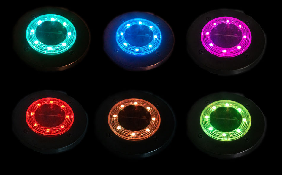 AUTO 6 COLOR CHANGING LED FUNCTION: If you want to make your garden or pathways looking very beautiful, then look no further, because this bright solar powered garden lights with 8 led beads. 6 RGB(red, green, blue, turquoise, orange, pink) Colors change in cycles, adding a beautiful scene to the night scene at night. The colorful lights adding the perfect Landscape Lighting to your deck, garden, patio, corridor or pathway. LIGHT DIFFUSING LENS : New light diffusing lens helps reflect light in different directions, allowing light to spread out evenly. Just like little shining diamonds, these will help illuminate your pathway, patio, lawn; but also add your home, garden, yard beautiful and elegance scene at night. WATERPROOF DESIGN : Waterproof designed and molded with high-quality material with stainless steel, abs plastic stake and the rubber seal around the rim. IP44 waterproof feature make led solar disk light suitable for outdoor use. No worries about rain, snow, frost, or sleet. But keep it from soaking in the rainwater. EASY TO INSTALL: 15-20 seconds to install the in-ground lights to the ideal places. Please make sure it can be exposed in the direct sunlight. Insert it into soft soil or dig a hole for it in advance. Otherwise its easy to use these without the stake as well. It can be mounted on your driveway, pathway, sidewalk and other areas of your garden to help to illuminate your path. Ultra Bright & Efficient : Our upgraded solar lights have built-in 600 mAh large-capacity 18650 lithium rechargeable batteries. Which means it can light up for 8 hours when fully charge and provide continue illumination even on occasional rainy and cloudy days.Dimensions:5"x5"x5" Weight: 1 Lbs 3 Ounces Product Description