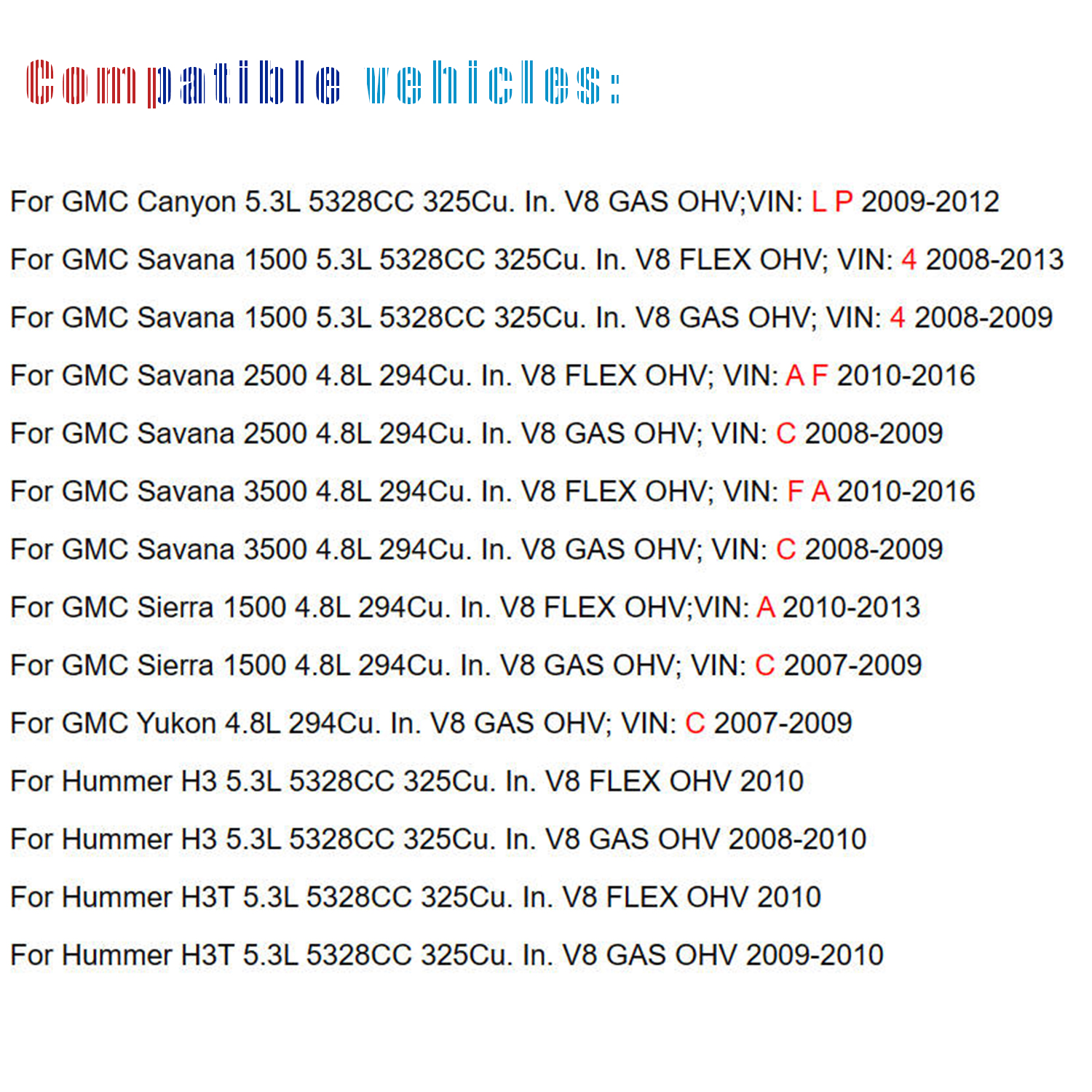 For GMC Savana 3500 4.8L 294Cu. In. V8 FLEX OHV; VIN: F A 2010-2016