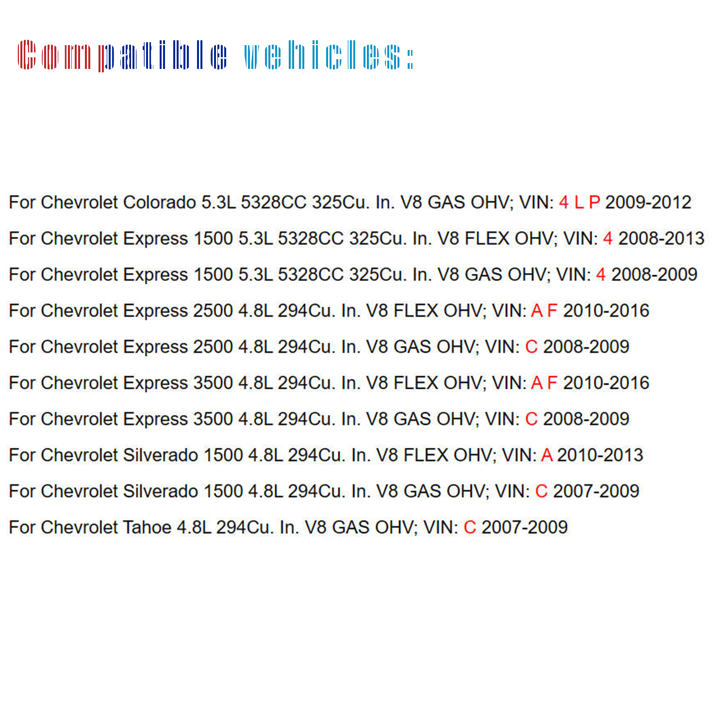For Chevrolet Express 2500 4.8L 294Cu. In. V8 FLEX OHV; VIN: A F 2010-2016