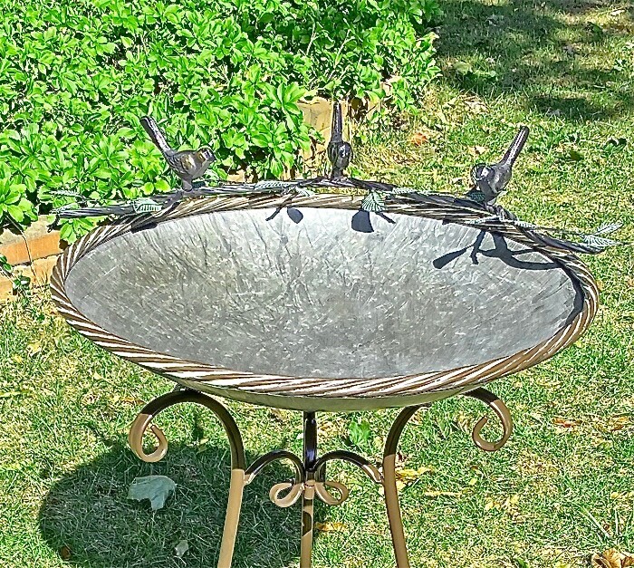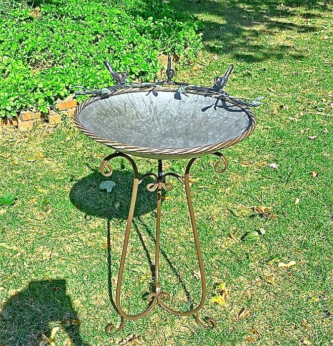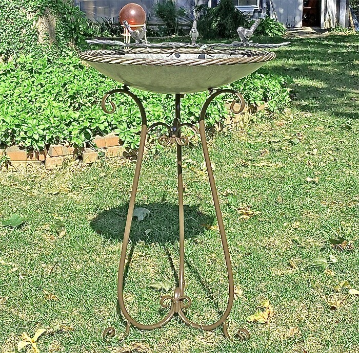 Birdbath Galvanized Metal Bowl with Iron Roped Trim , Iron Base, Brown Finish on Trim and Base. The Birdbath measures 29.5” High including the Base. The Bowl measure 20” in Diameter. This would make a great addition to the Garden. Some Assembly required.