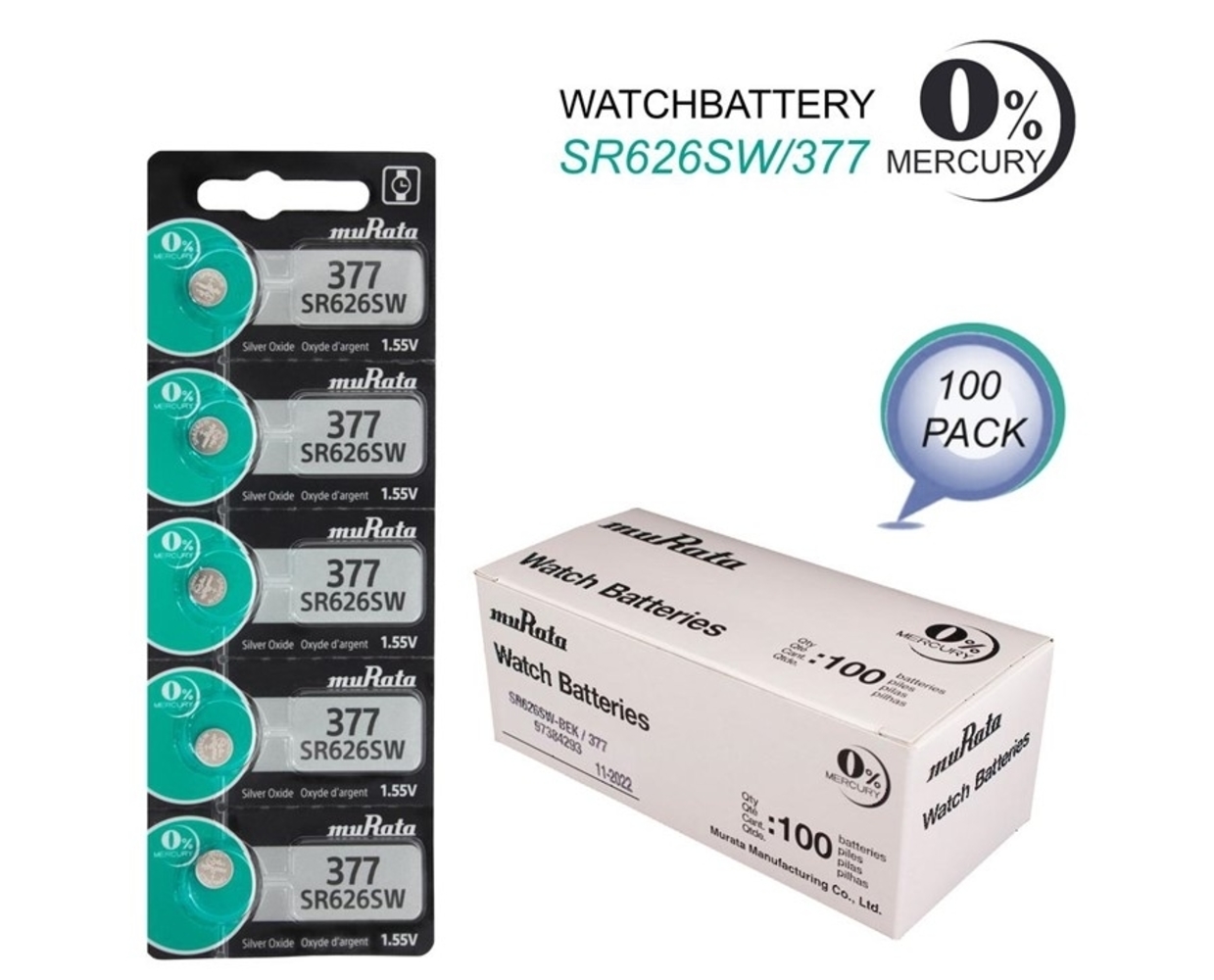 Murata 377 (SR626SW) Silver Oxide Watch Battery (100 Pack)