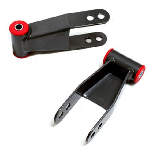 Maxtrac offers up rear lowering shackles as a sure fire way to get the back end of your truck out of that stink bug stance. These shackles give a minor drop in the rear of 1.5" or 2". Get your truck sitting level in an hour, easily installed, and of better quality than the OE parts being replaced. Constructed of solid steel, urethane bushings, and powder coated, these give you the look you're after.