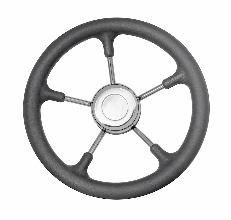 für Sportboote Edelstahl / grau, 35cm Durchmesser Produktnummer: M24037 - aus Edelstahl - mit Polyurethan Kontur in grauem Lederlook - antimagnetischer Griff - Durchmesser 350mm - Lenkradwelle 3/4" ( 19mm) - konische Aufnahme für Teleflex-Lenkung (17-19mm) |