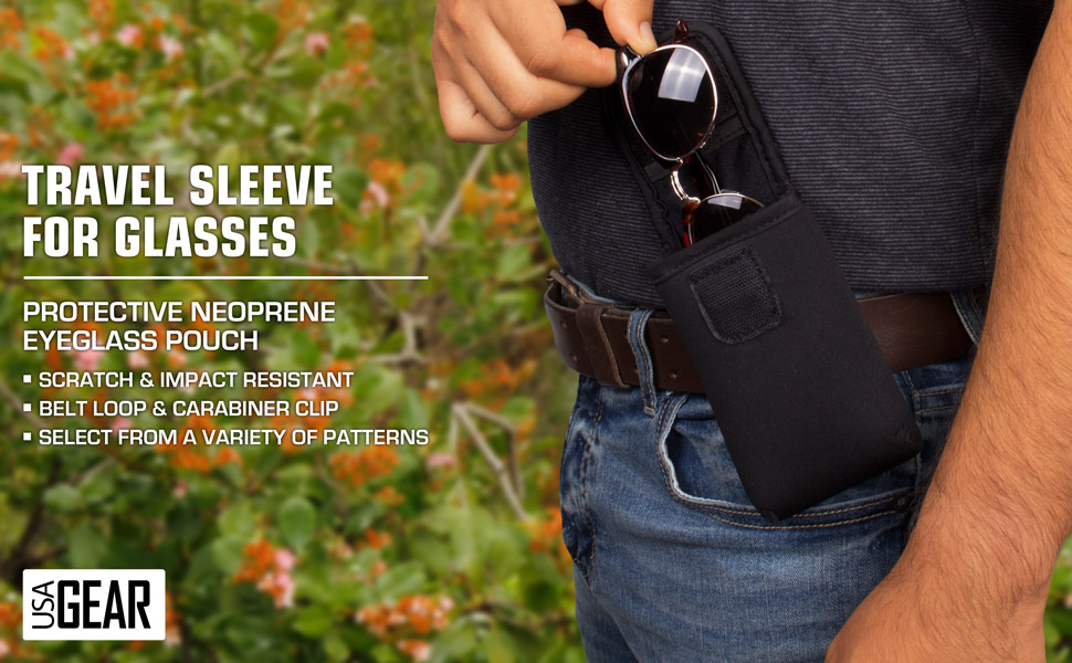 Protect and store your glasses in USA Gear's D50 Glasses case. Made from durable and flexible neoprene, the exterior is resistant to bumps, dust, moisture, and small impacts. The padded interior is scratch resistant to ensure your glasses stay in their best condition. The fabric of the sleeve can stretch to fit most safety glasses, and the carabiner clip allows you to easily carry it at your waist, attached to a bag, and more.