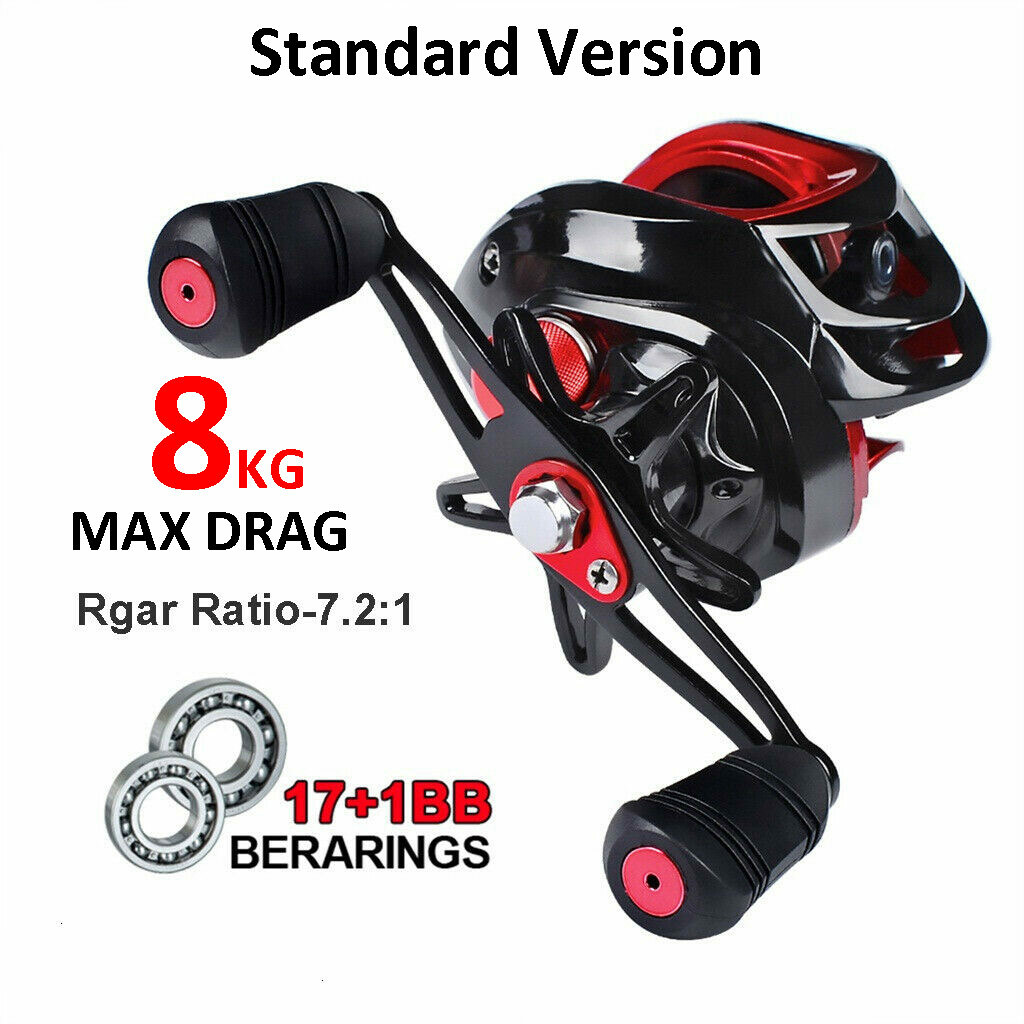 Package:1 Fishing Reel Specification: Ball Bearing:18+1/17+1 Gear Ratio:8.1:1/7.2:1 Drag Power:17.6lbs Line capacity (mm/m): 0.26/140, 0.28/120, 0.30/110 Weight :210g/7.4oz Feature: - Low profile design bait caster with a super silent high speed 8.1:1/7.2:1 line retrieve. - Precision cut brass gear structure and carbon fiber drag system delivering 17.6LBs of drag offer the ultimate in a high performance low maintenance baitcasting reel package. -18 + 1/17+1 shielded corrosion resistant ball bearings for super smooth casting, retrieve, and long life. - Magnetic brake system and powerful precision matched brass gears. Note: The collection of fishing line is distinguished between left and right hands. Please choose whether to buy left or right hands depending on the situation Please allow 1-2mm manual measurement error. Light shooting and different displays may cause the color of the item in the picture a little different from the real thing. Please be carefully check the goods appearance, size, shape and then compare your original goods before ordering, thank you.