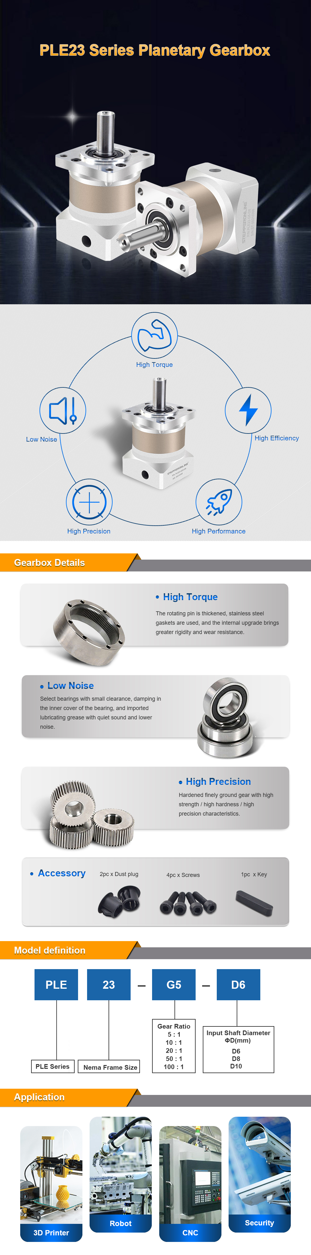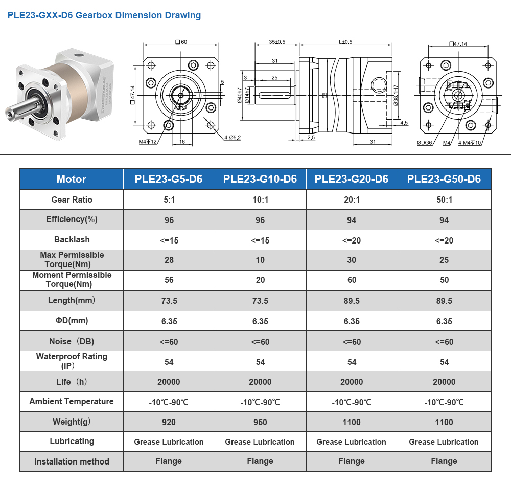 This high-precision planetary gearbox is belong to PLE series gearbox, it has a maximum 15 arc-min backlash. It's an excellent choice for applications that require good accuracy and reliability at an exceptional value. This inline planetary gearbox built-in an input shaft coupling which can match any standard 6.35mm(1/4 inch) diameter shaft of Nema 23 stepper motor, brushless dc motor and servo motor.