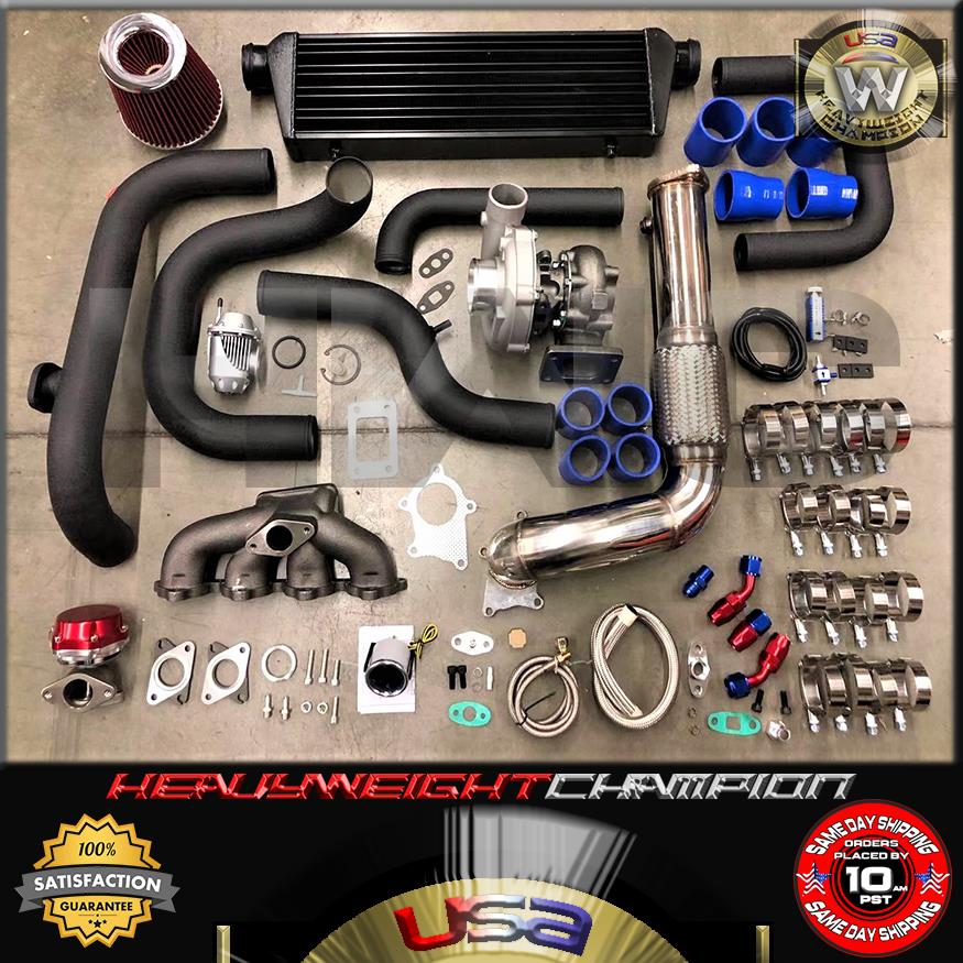 HWC has the best products with the best prices. We believe in Safety and Standards in both machining and manufacturing. Unlike our competitors who offer you low prices for inferior products, we build products that lift and level your vehicle without compromise. Cutting corners is awesome when driving your car but not when manufacturing, Allow to keep Power Steering. buy right, choose Supreme. 1992-1995 B16A Civic SiR II JDM 1992-1995 B16A2 Civic Vti EDM 1999-2000 B16A2 Civic Si USDM 1994-1997 B16A3 Del Sol VTEC USDM 1994-1997 B16A3 Del Sol Vti-T EDM 1994-1997 B16A3 Del Sol Vti-T EDM 1996-2000 B16A4 Civic SiR II JDM 1997-2001 B16B Civic Type-R JDM TYPE R 1994-2001 B18B1 Integra USDM 1994-1995 B18C Integra Si VTEC JDM 1995-1999 B18C Integra SiR-G JDM 1996-2000 B18C Integra Type R JDM 1994-2001 B18C1 Integra GS-R USDM 1996 B18C3 Civic VTi 1.8 1997+ B18C4 Civic 1.8 Vti EDM 1997-1998 B18C5 Integra Type R USDM 2000-2001 B18C5 Integra Type R USDM 1996+ B18C6 Integra Type R EDM 1996+ B18C7 Integra Type R Australia **This kit allow to Retain AC & Power Steering System **Minor modification require for Radiator, intercooler or hardware fitting **Designed for most vehicle running a B16/B17/B18/B20 swap (Civic, Integra, Del Sol etc) **Major modification for 88-91 Civic CRX ef models **Professional TURBO INSTALLER is Highly recommend. Any damage during installation will not be refunded. Condition: 100% Brand New Never Used or installed. TURBOCHARGER Turbo Spec: Standard 5 bolt T3 Downpipe Flange. 5 Bolt Standard Hot Side. Standard T3/T4 Flange. Oil Inlet - 1/8 NPT Oil Inlet. Bearing Type - Journal Bearing. Wet Floating Bearings. Cooling Type: Oil Cooled. Compressor Spec: 3" Compressor Inlet. 2.130" Inducer. 2.755" Major. 2" Compressor Outlet . T04B/T4 Type Compressor Housing. Compressor .49 A.R. Compressor .50 Trim. 8 Blade Type T4 Compressor Wheel. Turbine spec: T3 Type Turbine flange. T3 5 bolt flange. Turbine .57 A.R. 2.205" Minor and 2.570" Major Propellar. T3 Turbine Housing. 2.274" Outlet. 12 Blade Type Turbine. BOTTON MOUNT MANIFOLD Standard T3/ T4 (T03/ T04) Turbo Flange Configuration Outlet. Included Wastegate Flange for 35mm/38mm external WG. Increase Engine Intercooler Output and Efficiency. Made of High Quality Cast Iron Material for Strength and Durability. DOWNPIPE Made by High Strength T-304 Stainless Steel Construction. Increases High Flow Air Rate and Maximizes Performance. TIG Welded CNC Machined Flange and Mandrel-Bent Piping. Made of High Quality T304 Polished Stainless Steel Material. Pre-Weld O2 Bung. BOOST GAUGE measures up to 35 psi in pressure. Digital display with Blue and Red LED. Smoke tint lens during the day clear and bright LED Display during the night. High accuracy and easy operation. INTERCOOLER 6061 Light Weight Billet Aluminum Construction. Tube & Fin Light Weight Design. Construction: Machine Cut and Stamped Hand Welded. Working Pressure: 5~50PSI. Pressure Drop:2~5psi@35psi;0.2~0.5psi@15psi. Hot Air Temperature: 32°F~302°F (0°C~150°C) Compress Air Flow Rate: < 350 Cubic Feet/Min Rated to 500 Max HP. Overall Size - 28.95" x 7" x 2.5" 2.5" Core Size - 21.5" x 6.5" x 2.25" In/Outlet - 2.5 OD PIPING KIT Made of High quality T-6061 LIGHTWEIGHT Aluminum Piping. Powder-Coated Surface Finish. 2.5" / 2.25" Intake piping Diameter. 2.0mm Pipe Thickness. High Strength Silicon Coupler Hoses (3 Layers of Silicone) Durable Stainless Steel T-Bolt Clamp Included. Increase 65% Air Flow comparing with other Standard Piping. Come with BOV pre-weld Flange. SILICONE COUPLER For High Temperature and High Boost Application. Withstands Operating Temperatures from -65F to 500F Degrees Fahrenheit. Will Reduce Vibration Transfer Due to Hard Impact Shifting or Engine Movements. 4-Ply Nylon for Strong Reinforcement. Working pressure 80 PSI. Burst pressure 245 PSI. INTAKE FILTER Oil-free filter Micro cotton gauze type filter material washable with water or soap and reusable. Improves Up to 95% Filtration Efficiency. Designed to increase horsepower and acceleration. Width: 6" Inlet: 3.0" Overall Tall: 3.5" Mesh Tall: 2.5" SHORTY EXTERNAL WASTEGATE High strength Alloy aluminum body with steel head. Comes with 8 psi spring installed. Protect the turbo system from over boosting. Complete install kit included . BOOST CONTROLLER Allows to adjust PSI ratings without changing the wastegate springs as well as replacing the wastegate springs. High Performance Manual Boost Control From 0~30 psi Capacity. CNC Machined Light Weight and Resistant to Rust. Hose clamp and all necessary hardware for complete installation. 1-30 PSI Adjustable. BLOW OFF VALVE Aggressive JDM racing discharge sound. 8 Discharge ports that draw in surrounding air and release a unique discharge sound. 40mm hard-anodized valve for increased airflow. Dual spring system promoted response and allows for high boost pressures. Support up to 30 PSI boost pressure. OIL DRAIN & FEED LINE OIL DRAIN FEED LINE. 10AN Fittings. Inner Diameter: 0.50" Length: 17.00" CNC Machined Turbo Adapter Plate. Weldable 10AN Oil Pan Fitting Included. Inner Diameter: 0.25" Length: 36.00" 1/8 NPT Fittings Natural Polish Finish. CNC Machined Turbo Adapter Plate. Brass Fitting Block Fitting and Port Cover Included. NOTICE
