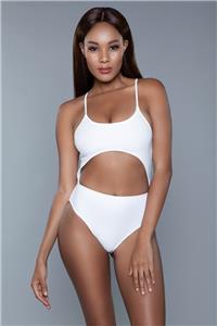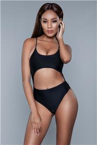 - Description: One-piece swimsuit features a round neckline, corset style lacing in the back, a cutout midsection and a high waist.