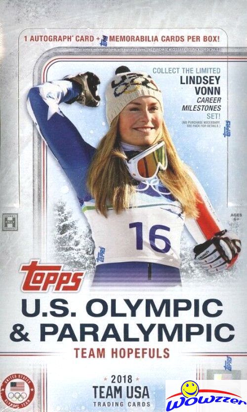 Wowzzer!! GO USA!! We are very proud to offer this 2018 Topps USA Olympics Team and Hopefuls Factory Sealed HOBBY Box!! This HUGE Factory Sealed HOBBY Box includes 24 Packs and 8 Cards per Pack! **Plus This Awesome Factory Sealed Box includes ONE AUTOGRAPH Card, 2 RELICS MEMORABILIA Cards & 2 Lindsey Vonn Career Milestones Inserts Cards! ! Topps U.S. Olympic & Paralympic Team and Hopefuls released in January 2018 as the only USOC licensed trading card product of the 2018 Olympic Winter Games.  It celebrates the legendary career of heralded skier Lindsey Vonn as she returns to the slopes in PyeongChang in search of her third Olympic medal. With 130 podiums and 77 career wins, Vonn is one of only two women in history to win four World Cup overall skiing championships. Look for ON-CARD Autographs of all the Top USA Olympic Stars and Legends including Lindsey Vonn, Chloe Kim, Kristi Yamaguchi,J Alex Shibotani, Ashley Wagner, Karren Chen, John Shuster and Many More ! Also Look for Relics and Commerative Relics of all the top USA Olympians!! This Product is LOADED! Good Luck with your Pulls!