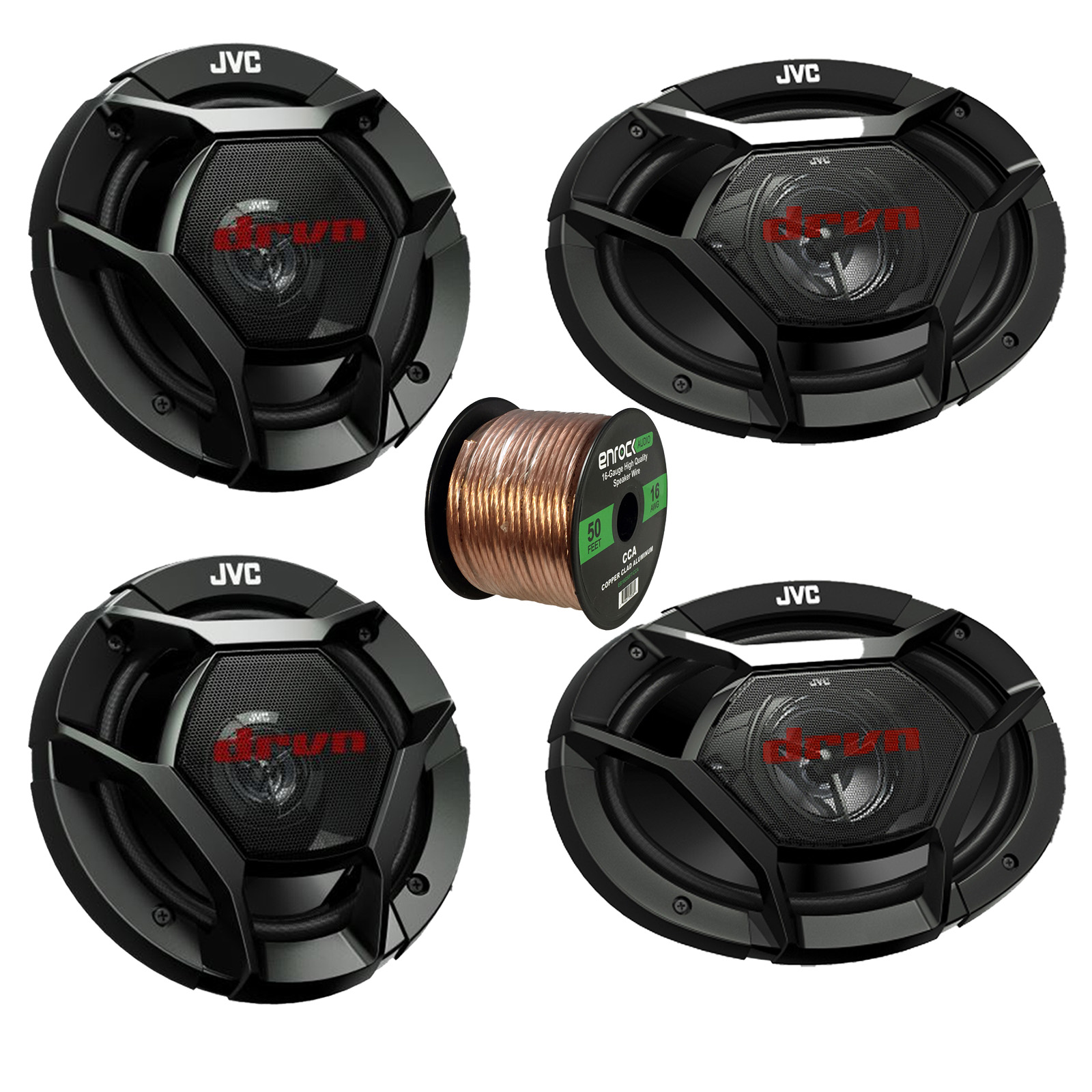 Car Speaker Package: Pair (Qty 2) of JVC CS-DR6941 6x9" 550 Watt Peak 4-Way Car Audio Speakers, 2x 6.5" 300 Watt Max 2-Way Vehicle Audio Speakers with 16-Gauge 50 Feet Wire