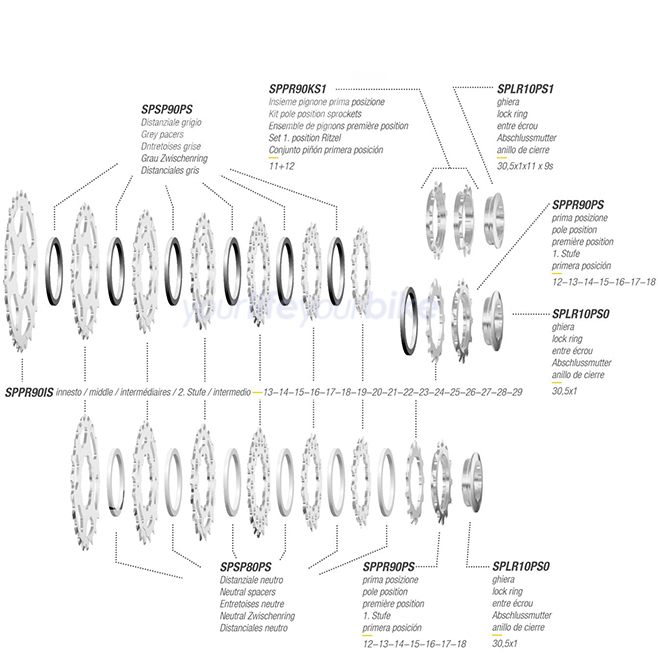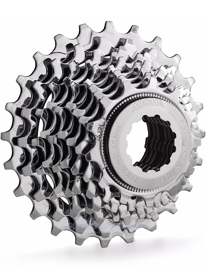 Zahnkranzkassette aus Italien. Die Ritzel sind mit Steighilfen und Aussparungen zur Gewichtsreduktion versehen. Kassette und Abschlußring aus hochwertigen HiTen Spezialstahl.