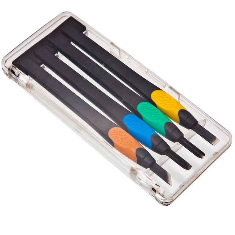 Schnitzwerkzeug-Set: 1 Hohleisen mit U-förmiger Schneide (5 mm), 1 Flacheisen mit gerader Schneide (6 mm), 1 Flacheisen mit schräger Schneide, 1 Flacheisen mit V-förmiger Schneide (5 mm)