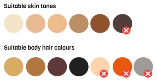 Philips Lumea works effectively on (naturally) dark-blonde, brown and black hair. As with other light-based treatments. It is not suitable for (naturally) red, grey and light blonde hair or for very dark skin types. Please consult the comparison table to determine which light intensities are most suitable for your skin and body hair colour and to check if this method is suitable for you at all (if it is not, this is indicated with an x ).