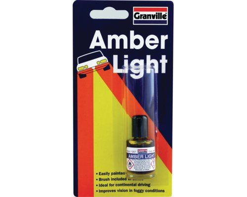 Granville Amberlight is a low viscosity amber coloured lacquer specifically designed for application to motor vehicle headlamps. Amberlight dries in 10-15 minutes to form a transluscent amber coating which is suitable for continental driving.