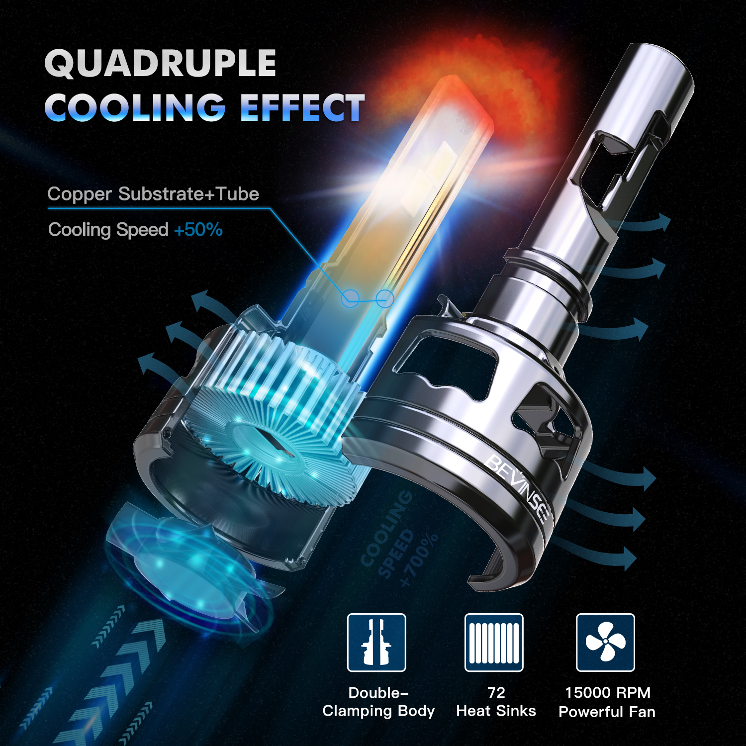 Les phares à LED de la série V45 sont livrés avec notre système de refroidissement VC à la pointe de la technologie. Prouvez votre efficacité dans l'élimination de la chaleur, conçu avec un substrat en cuivre + un tube en cuivre + une double pince en aluminium + 72 dissipateurs thermiques + un ventilateur silencieux et puissant à 15 000 tr/min, rendant votre phare 100% lumineux.