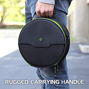 The adjustable and comfort designed shoulder strap accommodates people of all sizes and provides an elegant hands free travel option. Or grab on to the rugged and heavy duty carrying handle to quickly hit the road when you're in a rush. Although spacious enough to fit any headset (Interior: 9 x 9 x 4.25 inches), the circular design and carrying options make the ENHANCE headphones case more than just storage, it's a statement.