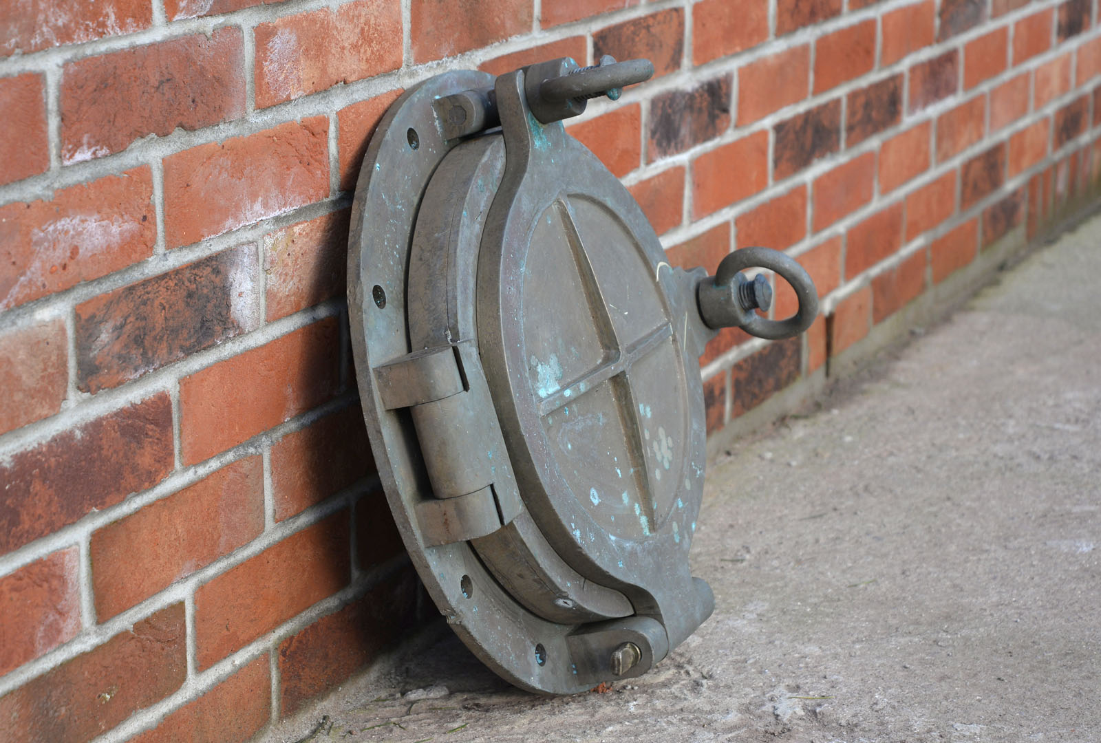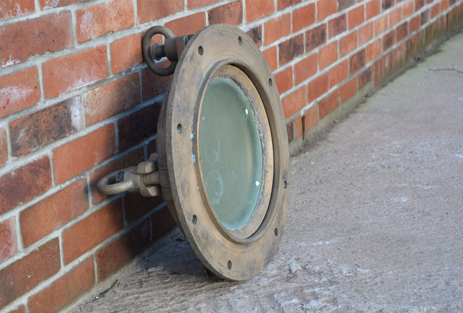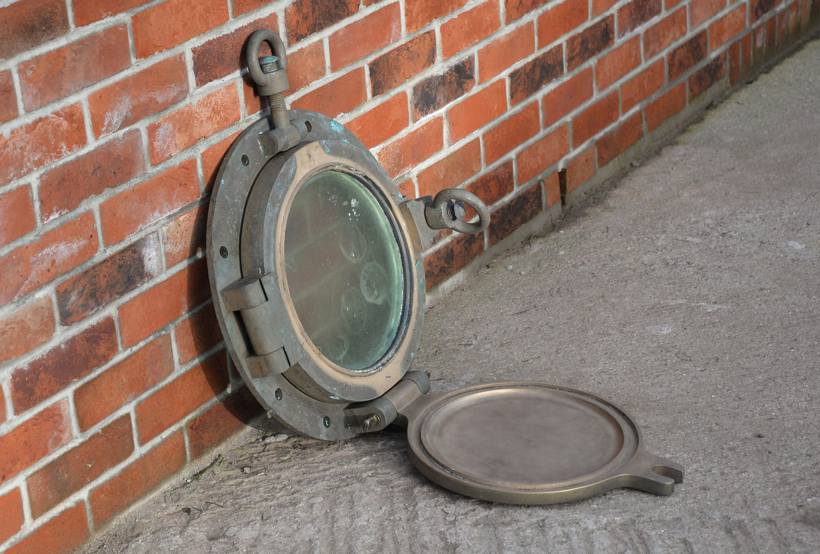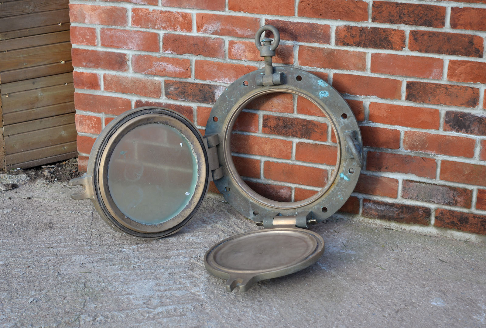 This porthole is unusually complete, it has its glass window, its storm cover and both key dogs, both of which turn freely. Sold in in "as found condition" so could be polished if you so wished or leave with its patina and tarnish.