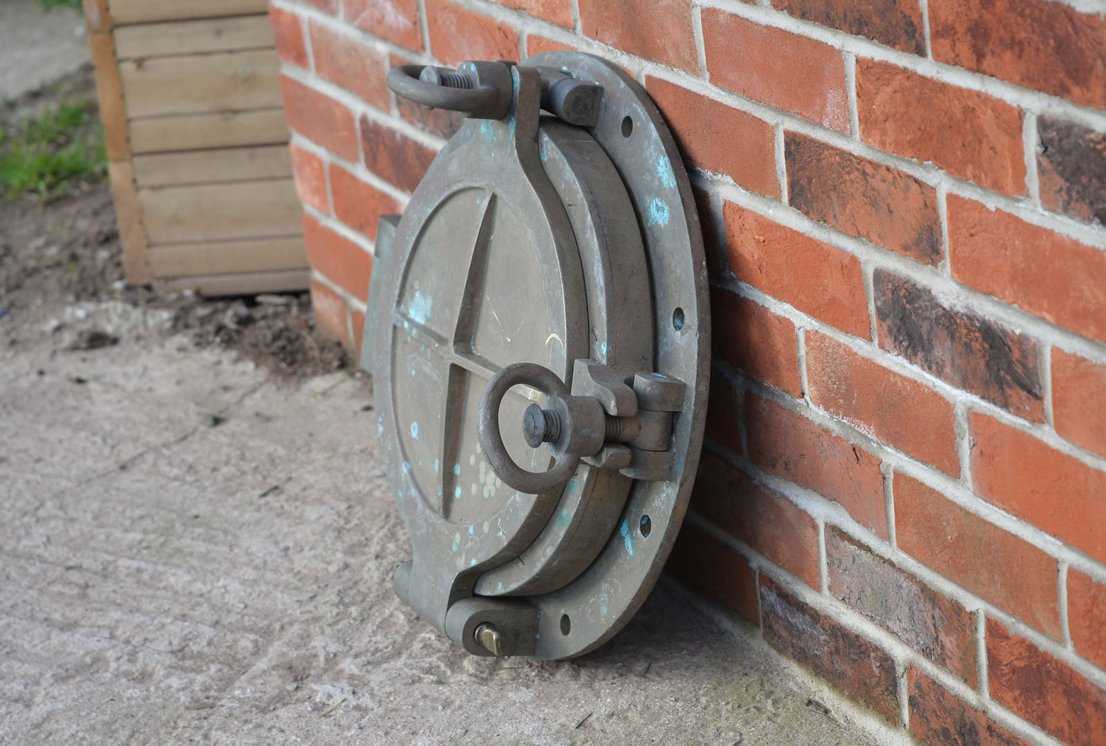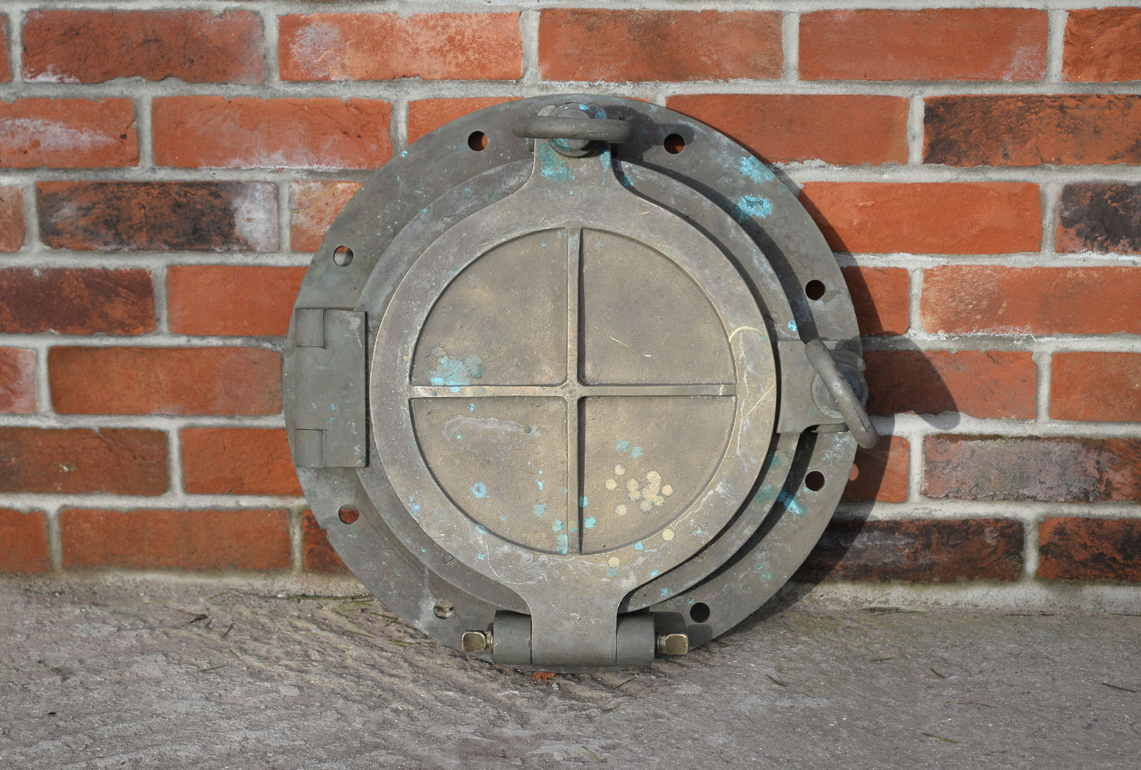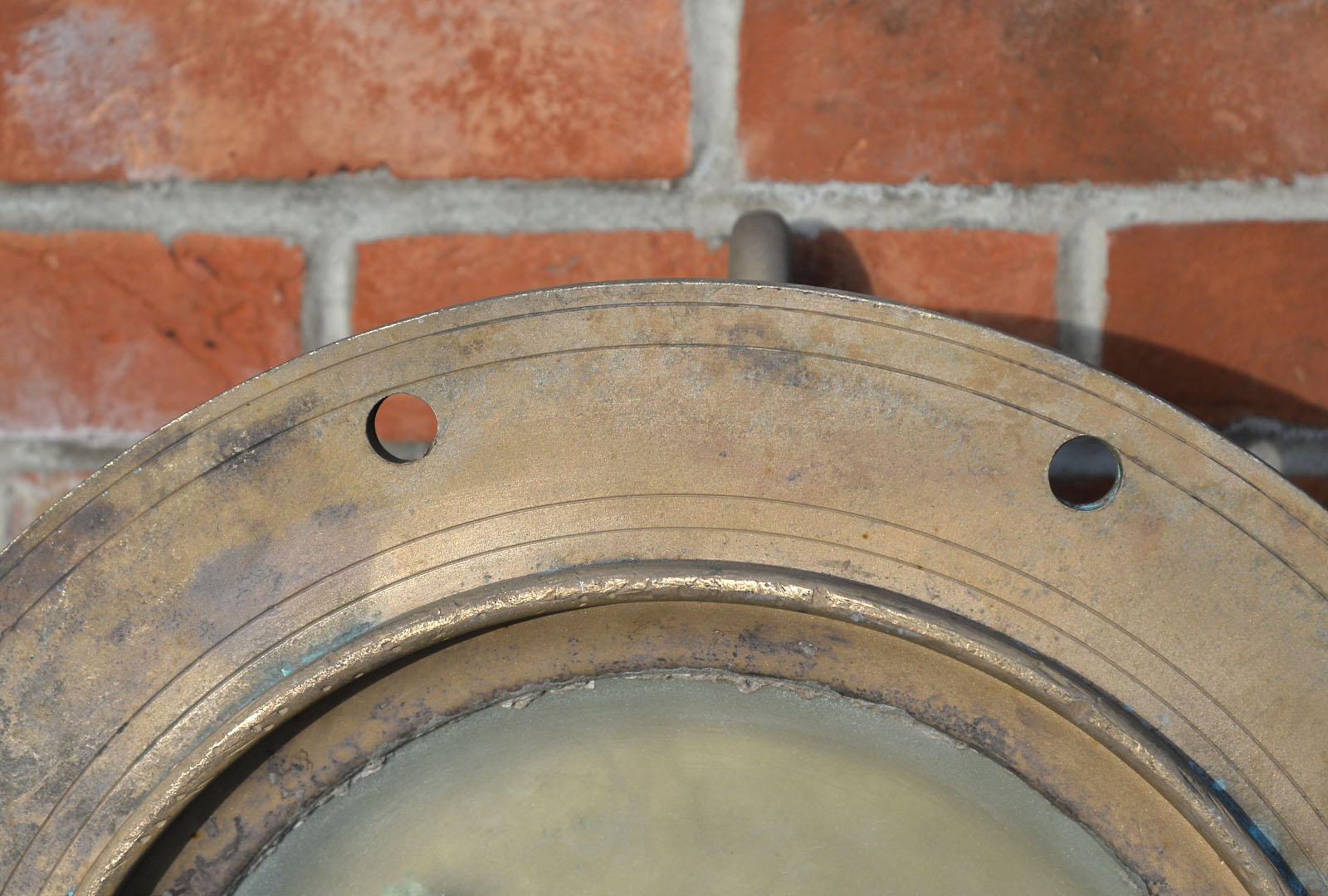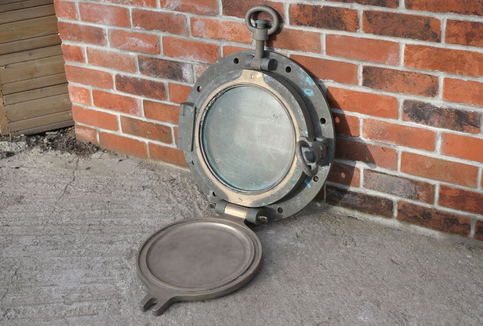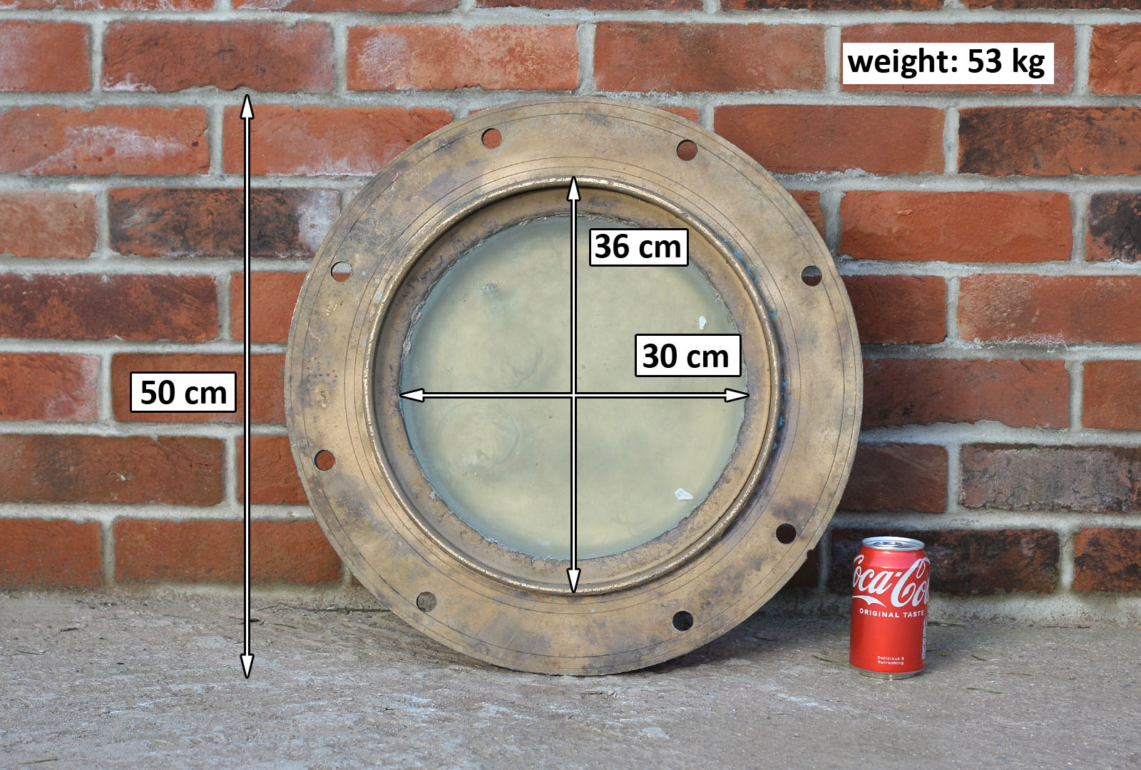 Welcome to my listing for this old fantastic bronze porthole. It is large being 50 cm across and weighs a whopping 53 kilos. Glass is in crack free condition although does have some small chips, marks and a "worn" look due to the effects of the sea and crustaceans.