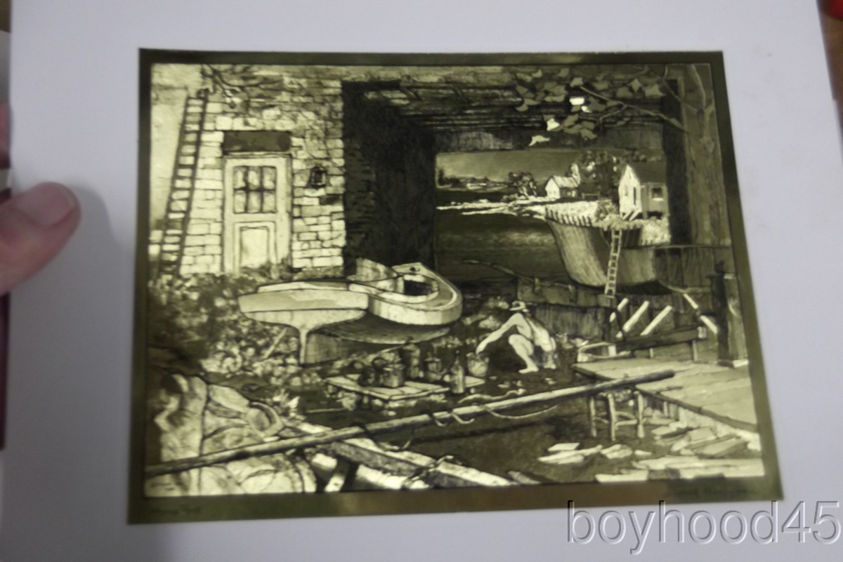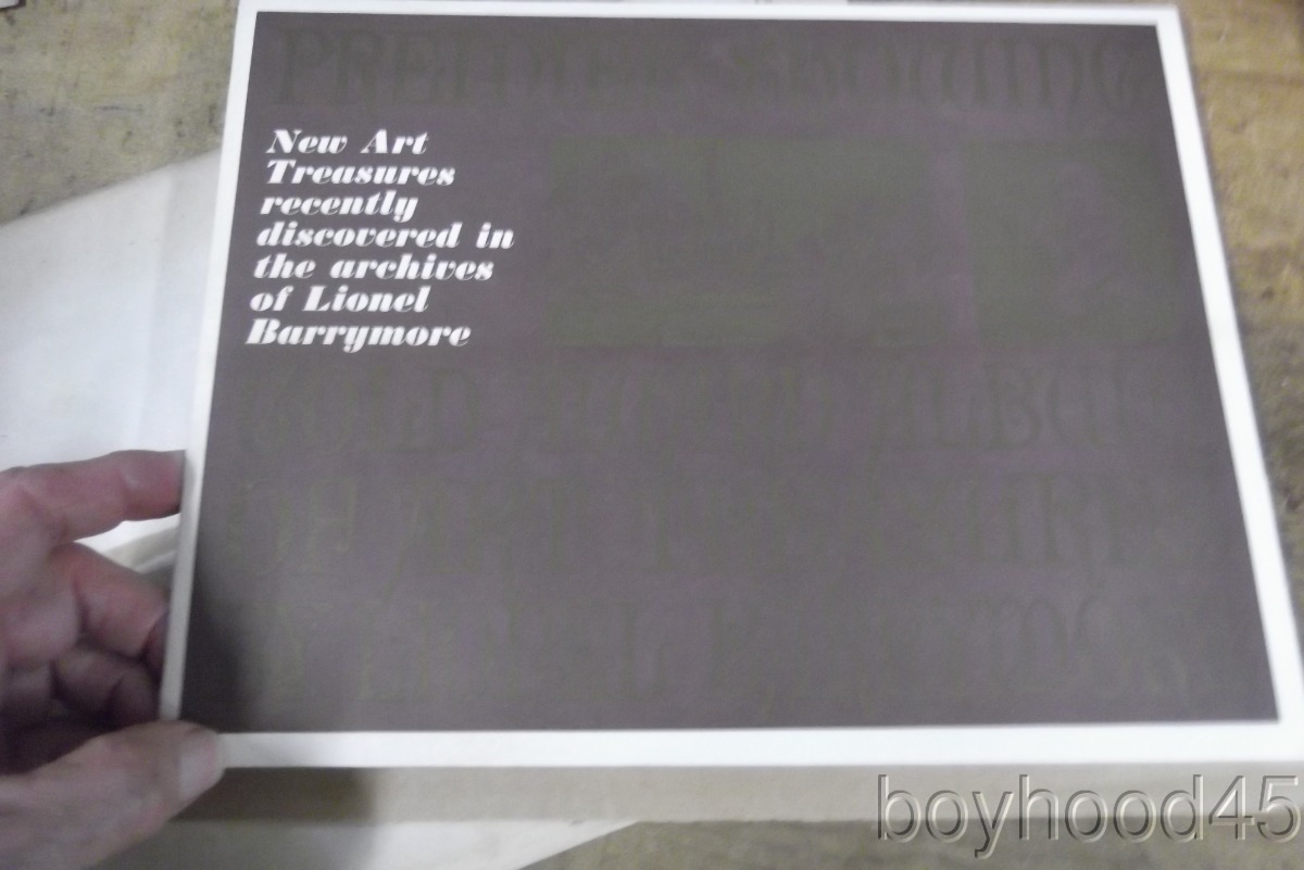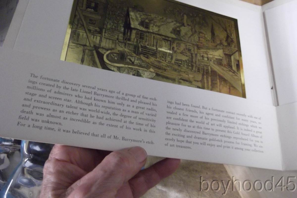 This is a folio of 4 Gold Etched Prints--"New Art Treasures Recently discovered in the Archives of Lionel Barrymore." Published by Brown & Bigelow/Standard Packaging Corp, New York, undated, circa 1970. The four etching appear in a folio. Near new!! The matted etchings measure 8 X 10 1/2. They are in perfect condition!! I have located one other folio of these etchings and it listed on Amazon for $50!! I will offer this lovely, complete folio for only $25.00 plus $4.00 S&H in the US.