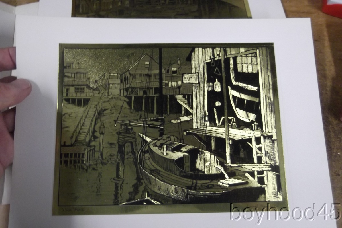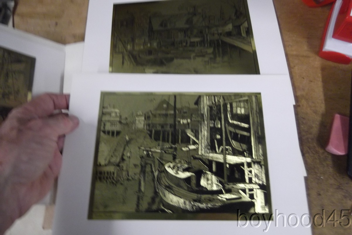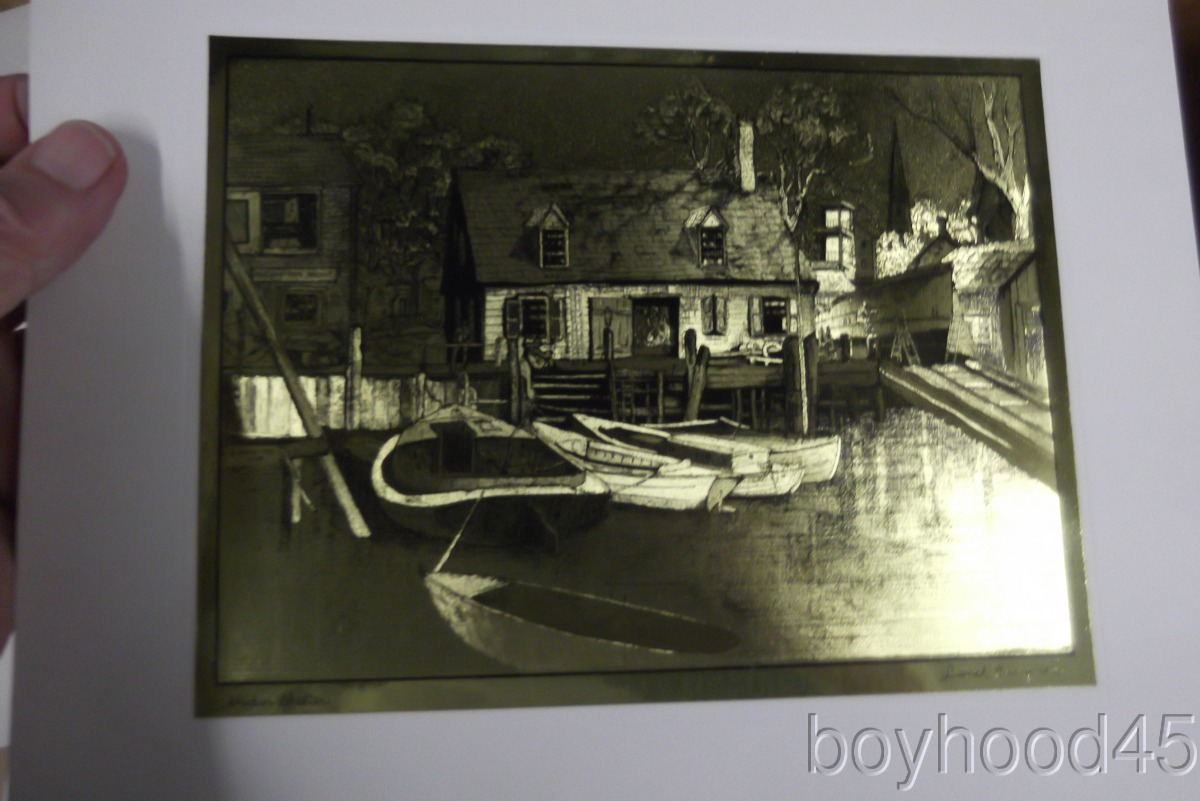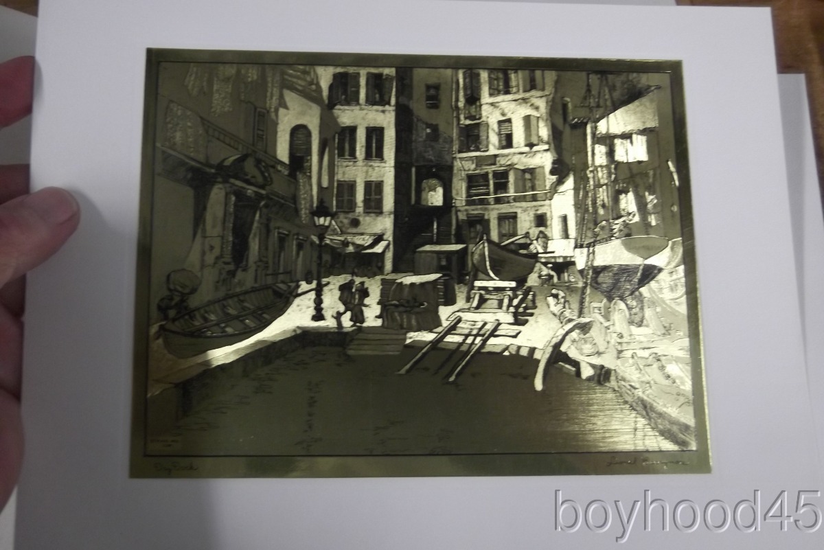 This is a folio of 4 Gold Etched Prints--"New Art Treasures Recently discovered in the Archives of Lionel Barrymore." Published by Brown & Bigelow/Standard Packaging Corp, New York, undated, circa 1970. The four etching appear in a folio. Near new!! The matted etchings measure 8 X 10 1/2. They are in perfect condition!! I have located one other folio of these etchings and it listed on Amazon for $50!! I will offer this lovely, complete folio for only $25.00 plus $4.00 S&H in the US.