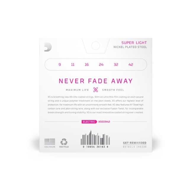 XS Nickel coated electric guitar strings provide the longest life of any D’Addario electric guitar string. Coated with our groundbreaking XS coating, these premium electric strings achieve maximum life and a smooth, fast feel without dampening their outstanding tone. Constructed with a NY Steel core, reformulated nickel-plated steel wrap wire, and Fusion Twist technology, XS Nickel strings boast superior strength and tuning stability, plus richer harmonics, greater clarity, and remarkable definition with every sweep, slide, and bend. This 9-42 Super Light gauge set is easy to bend and very flexible.