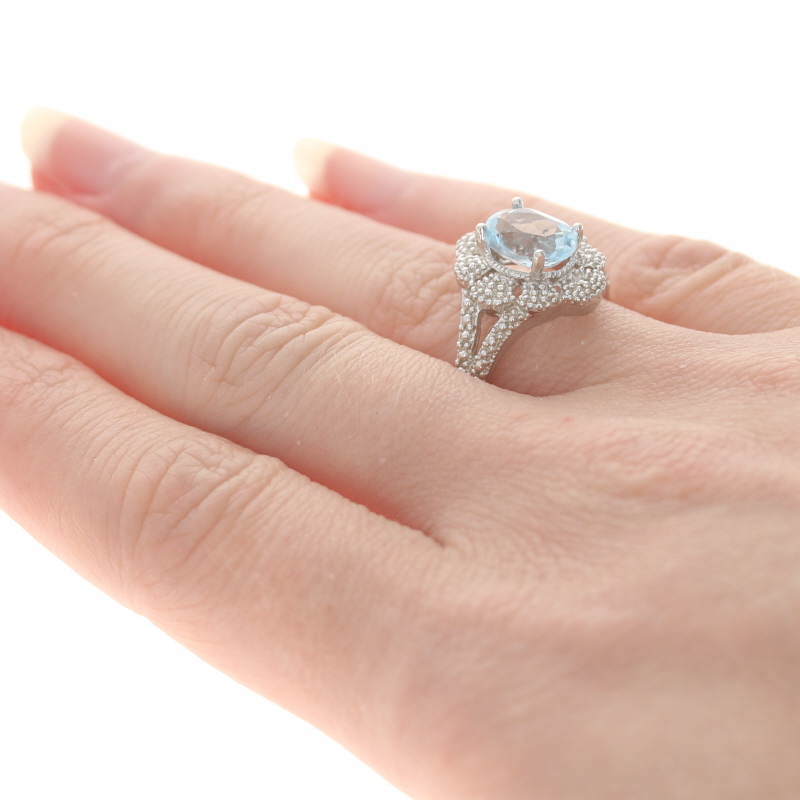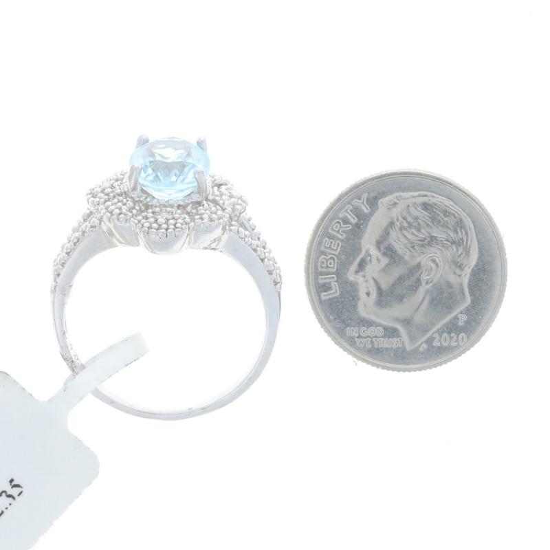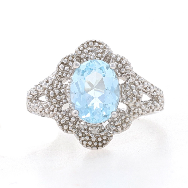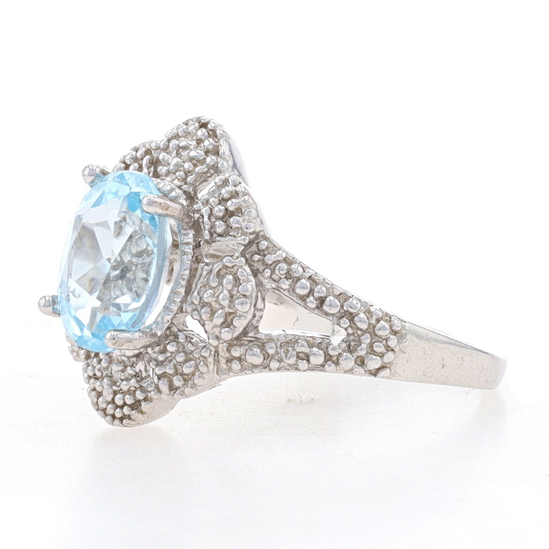 This lovely cocktail ring beautifully displays a large oval shaped genuine blue topaz gemstone. The stone is securely set in a sterling silver mount with detailed bead accenting. The beading displays two single cut natural diamonds that have a .01 carat weight, I2 clarity, and I - J color. This ring is new with the original tag.