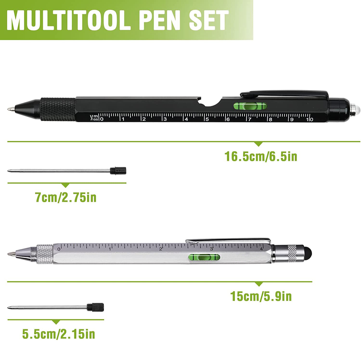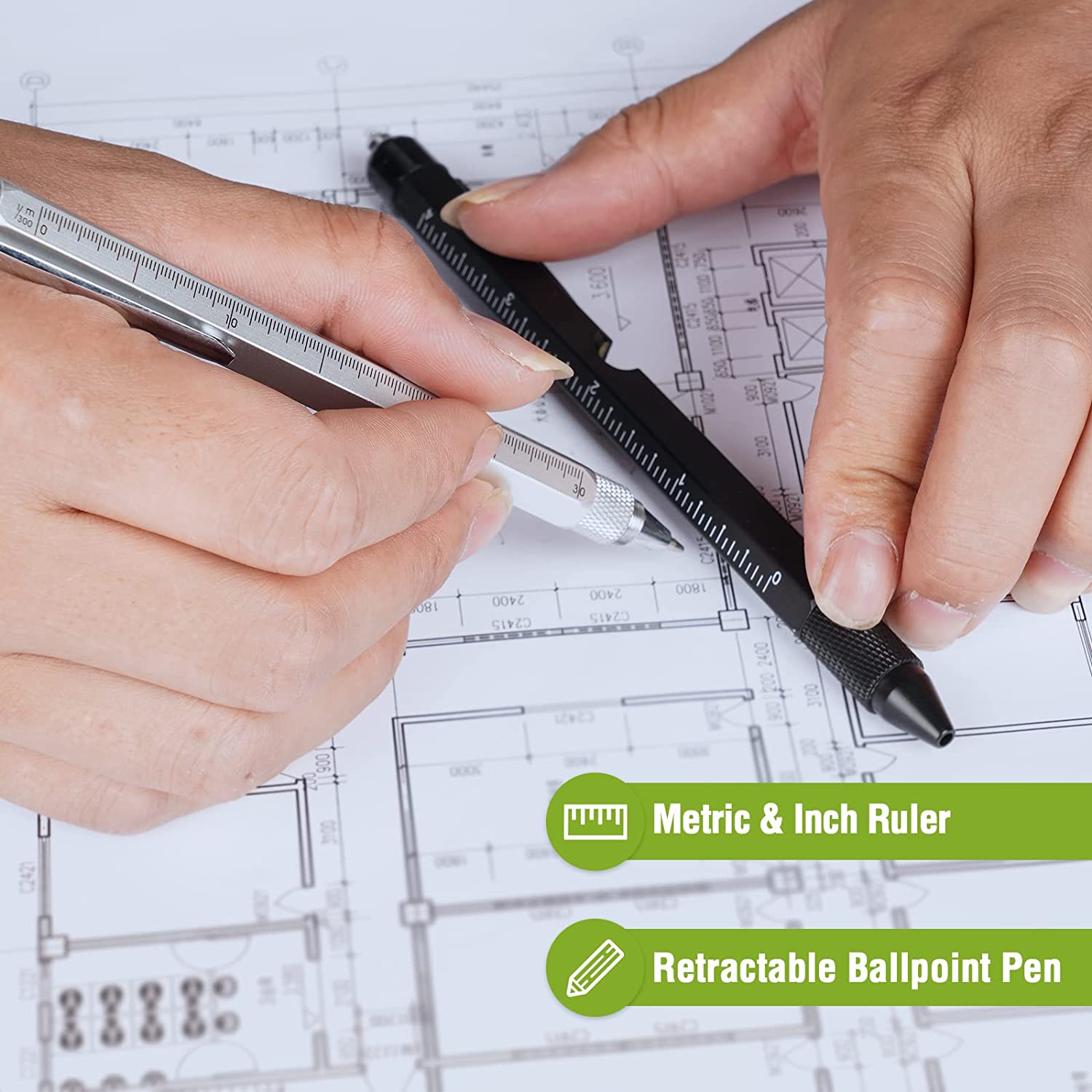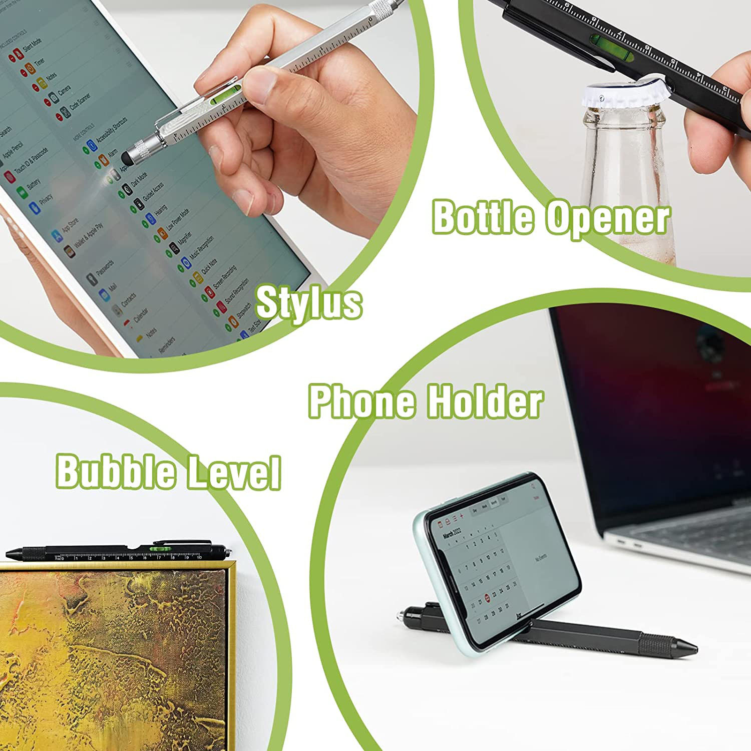 【10 in 1 MULTI-TOOL PEN】—Multi-tool pen set comes with a 10-in-1 and 7-in-1 multi-purpose pen, including the following features: retractable ballpoint pen, stylus pen, ruler (metric/inch), screwdriver (flat-head/ & phillips), bottle opener, phone holder, bubble level, LED flashlight. The multi-tool pens can bring comfort to life and work, making them an excellent choice for both the office and the home.