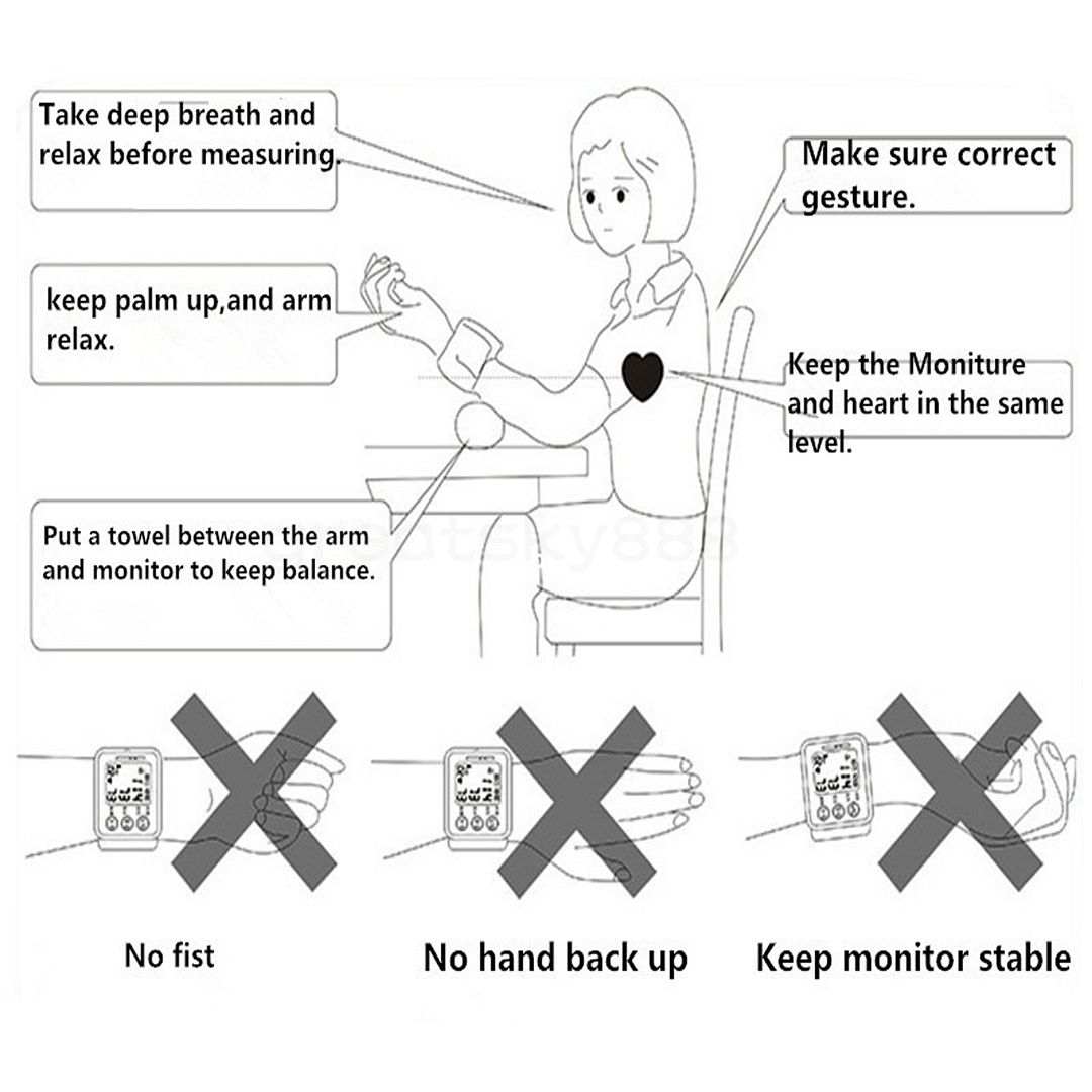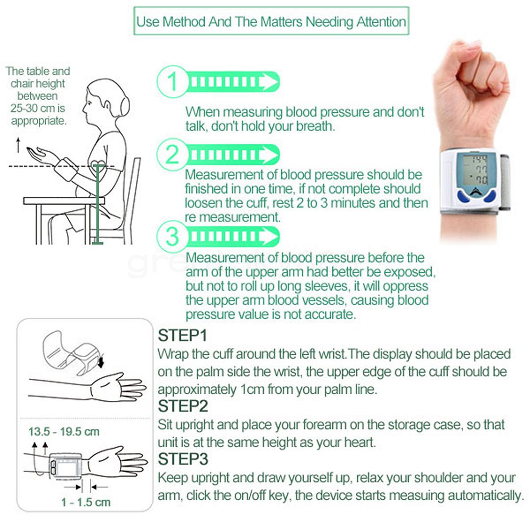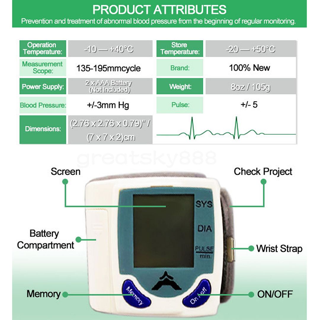 Item specificsRated voltage: DC 3V AAA battery (NOT included) Exhaust modes: Automatic(Automatic closing function) Power mode:Electric Pulse: Accuracy ±5 ( % ) Measuring range:20-280 ( mmHg ) Pressure accuracy ±3 ( mmHg ): Application of temperature: 5-40 ( c ) Rated power: 1 ( W ) Display mode: LCD Digital Package ContentDigital wrist blood pressure monitor 1pcs User Guide 1pcs