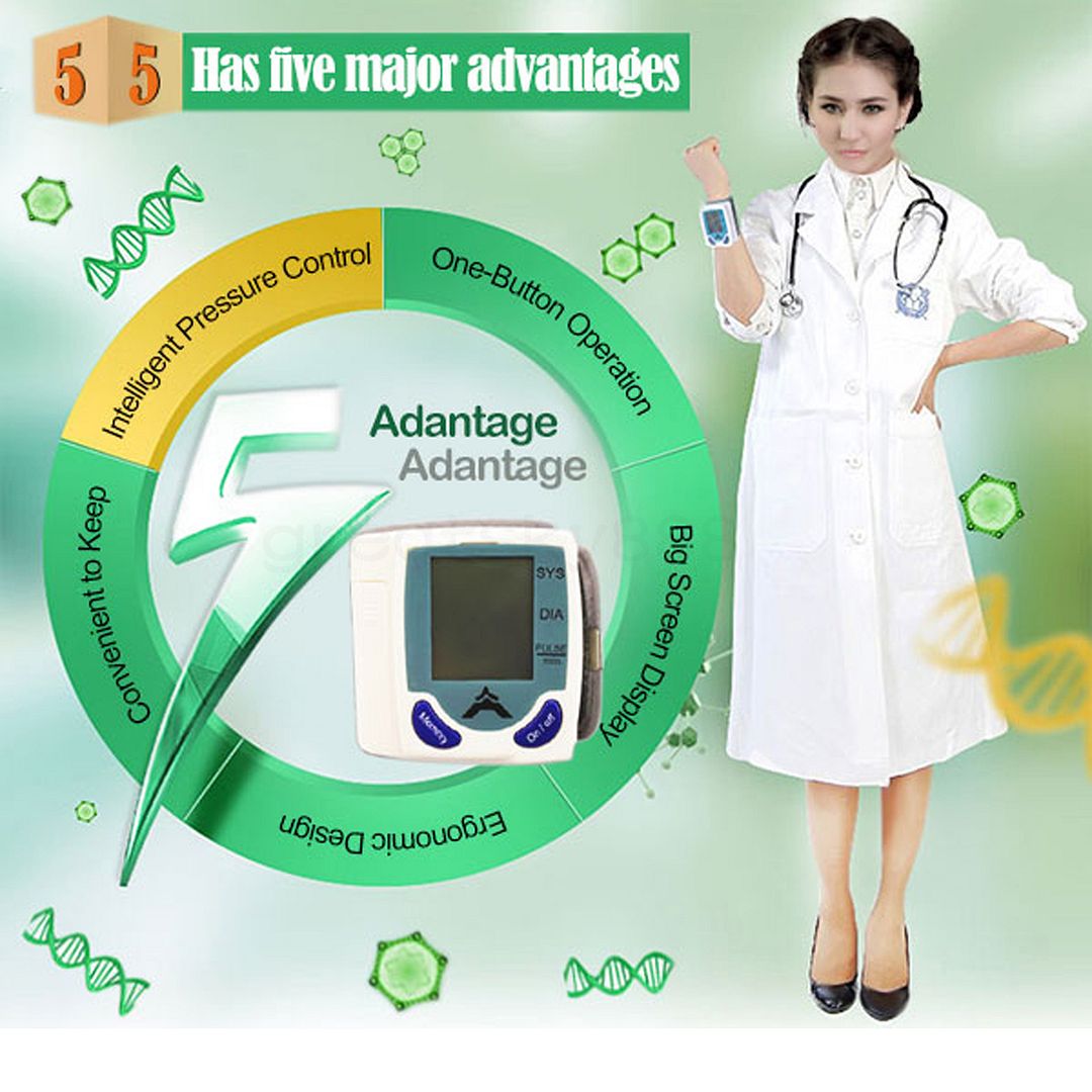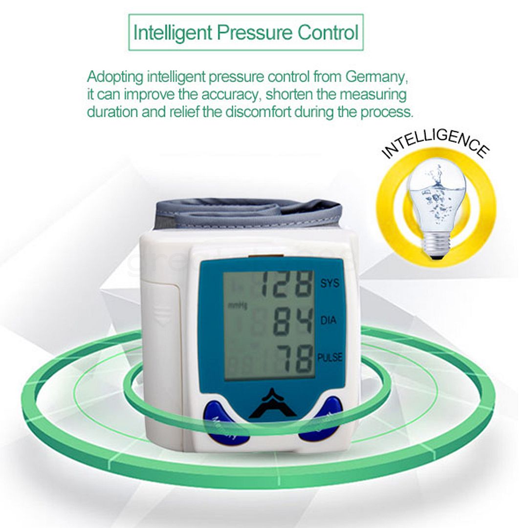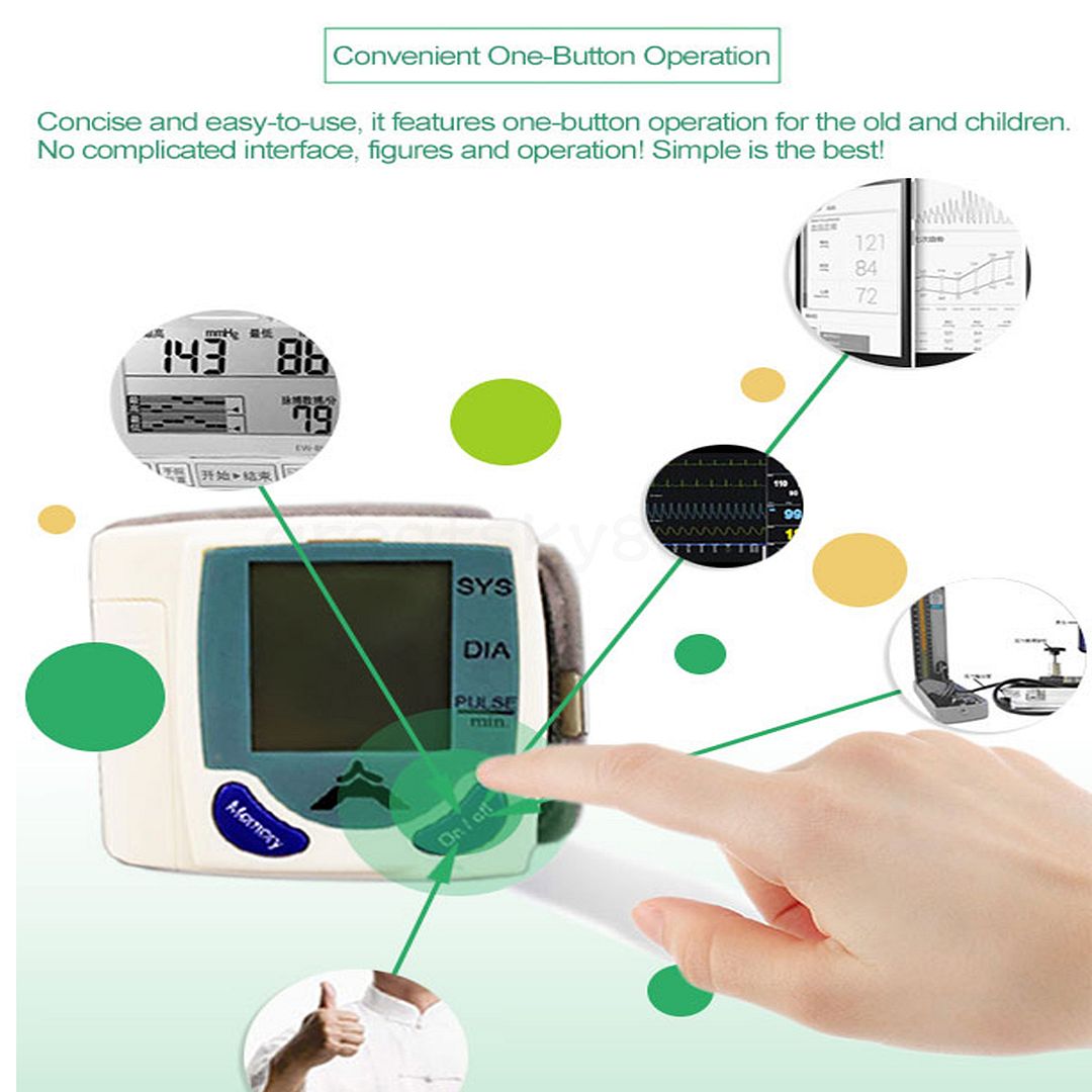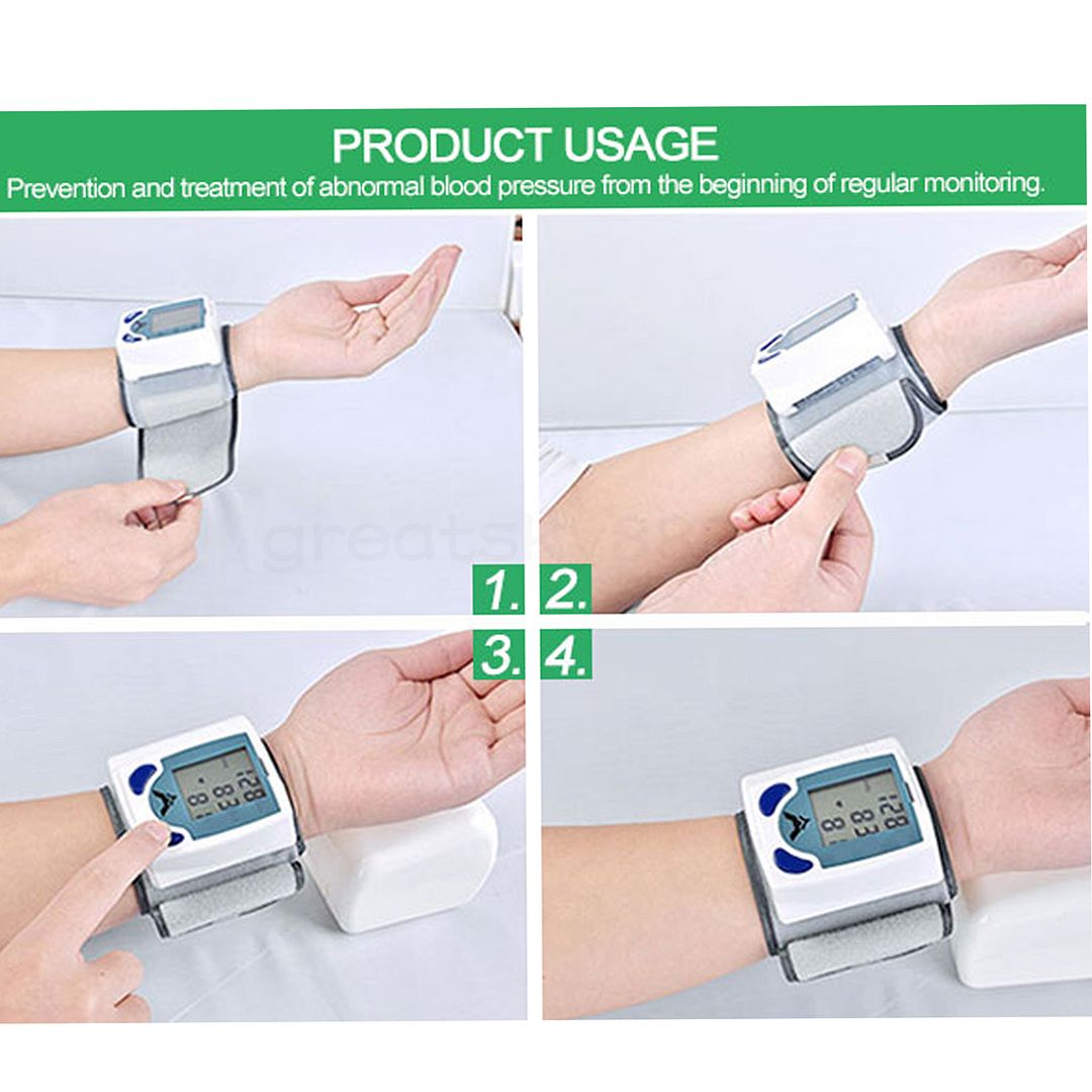 Item specificsRated voltage: DC 3V AAA battery (NOT included) Exhaust modes: Automatic(Automatic closing function) Power mode:Electric Pulse: Accuracy ±5 ( % ) Measuring range:20-280 ( mmHg ) Pressure accuracy ±3 ( mmHg ): Application of temperature: 5-40 ( c ) Rated power: 1 ( W ) Display mode: LCD Digital Package ContentDigital wrist blood pressure monitor 1pcs User Guide 1pcs
