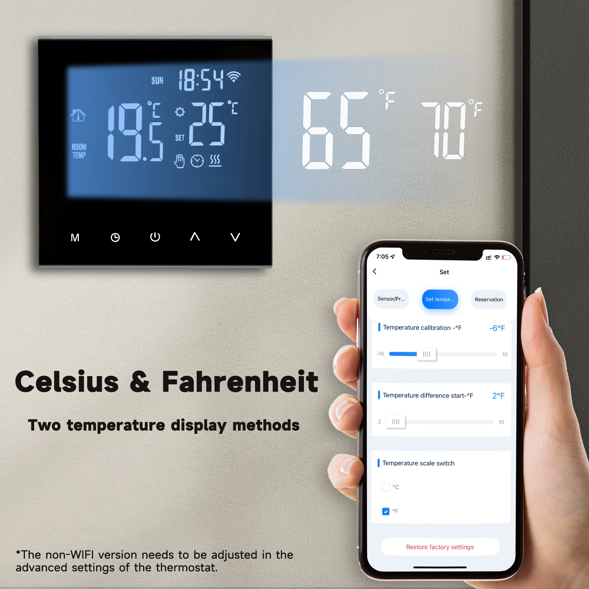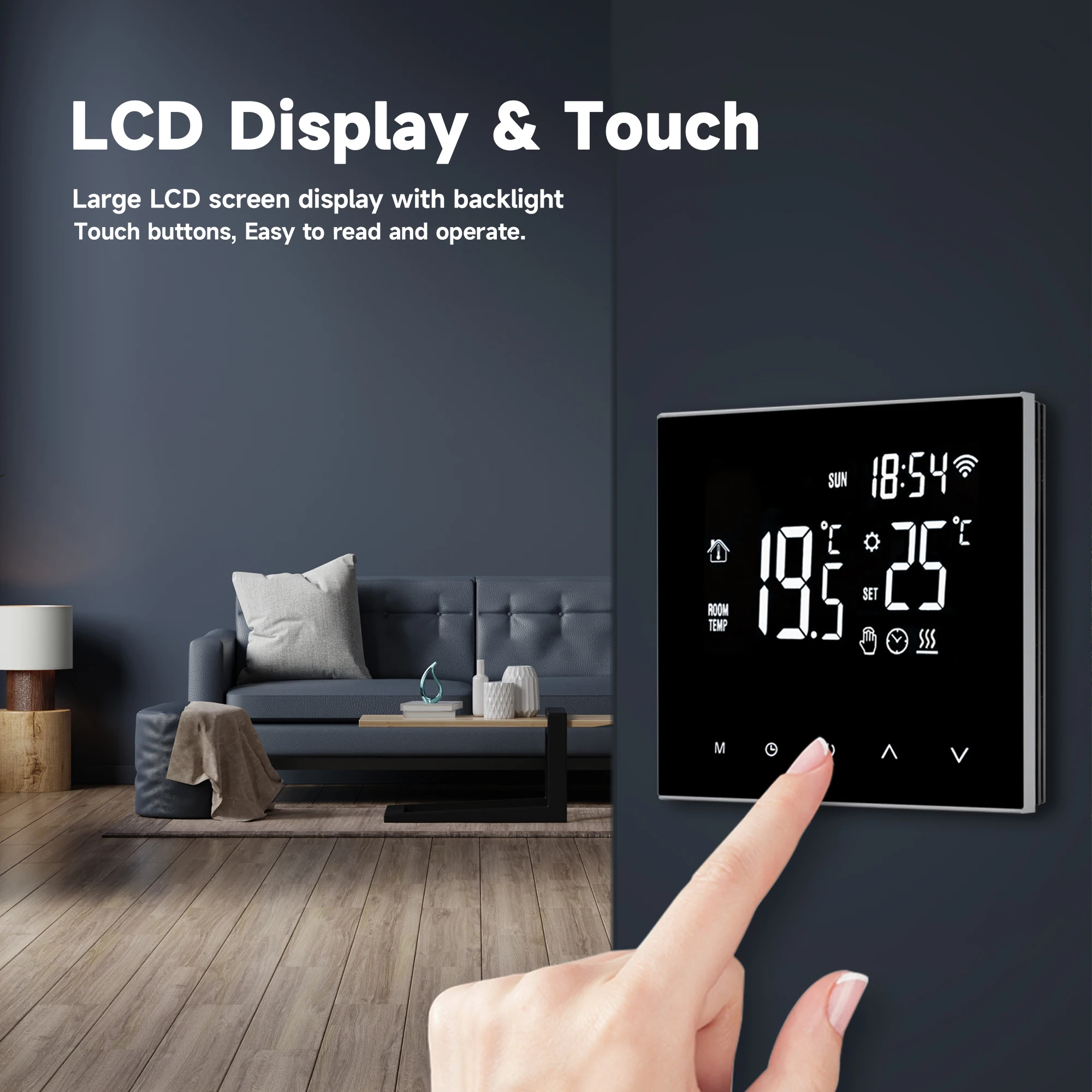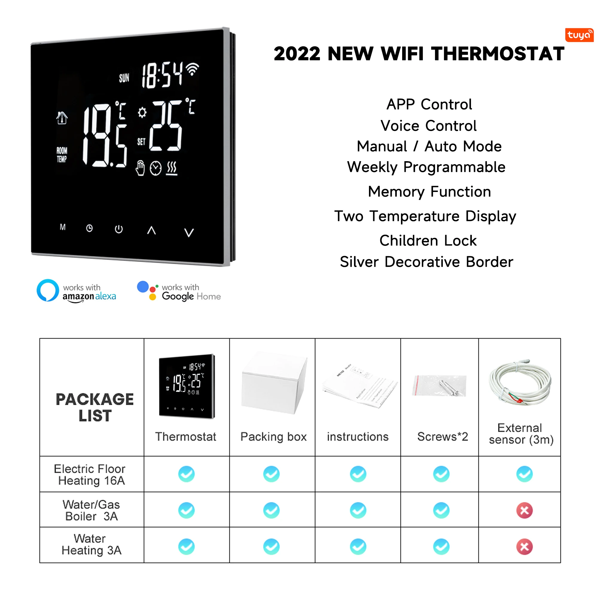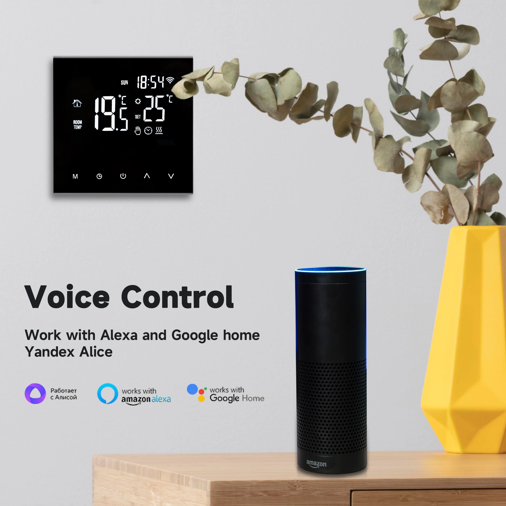 * Voice Control: Work with Yandex Alice, Amazon Alexa, Google home * LCD Touch Display: Elegant appearance, one face design, anti-scratch. Large LCD touch screen display with back light, easy to read. * APP Control: Smart thermostat that can be controlled by your phone before you come back home. (APP: Tuya) * Two temperature display: Celsius and Fahrenheit * Manual/ Auto Mode: Free to choose manual mode or auto mode for different purposes. * Accurate Temperature: Internal sensor floor sensor, perceptive ambient temperature and the floor's temperature. Automatically obtain the temperature, 1°C accuracy. * Weekly Programmable: The thermostat supports different temperature setting accordingly with 6 time-modes daily. * Memory Function: No need to worry about power failure, data memory when power is off. * Children Lock: Keypad locking function is designed to prevent children from operating by mistake. * Application: Suitable for electric heating/water gas boiler/water heating.Perfect for home, office, shopping mall, hotel, etc.