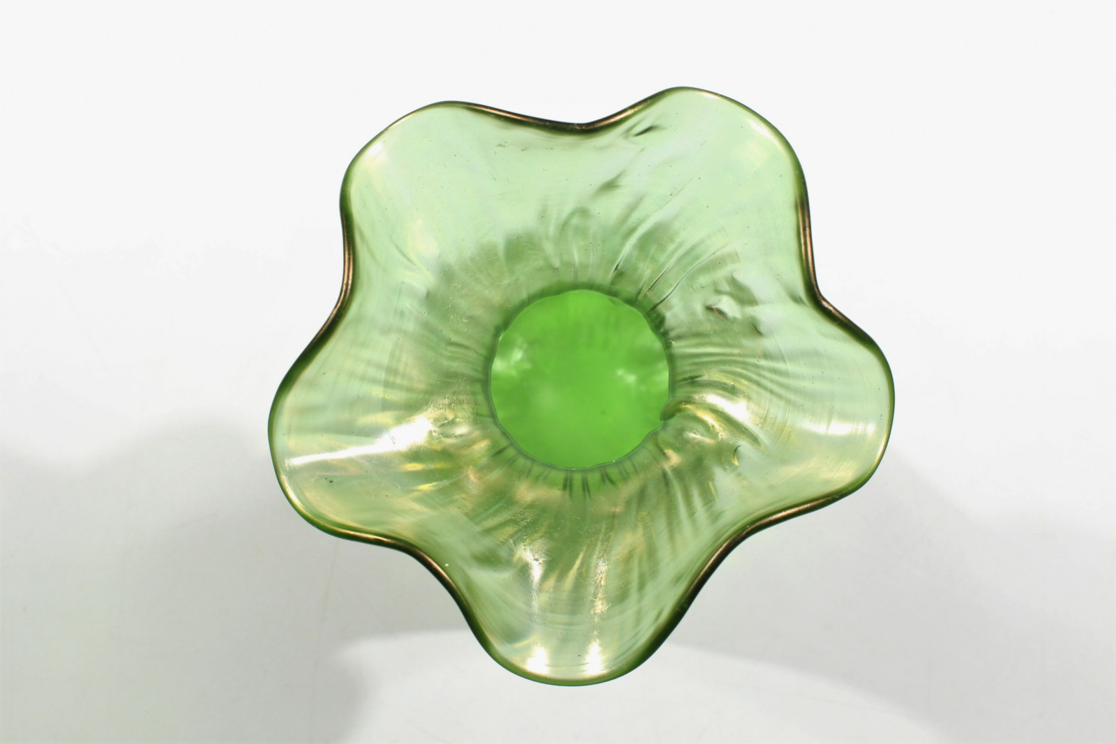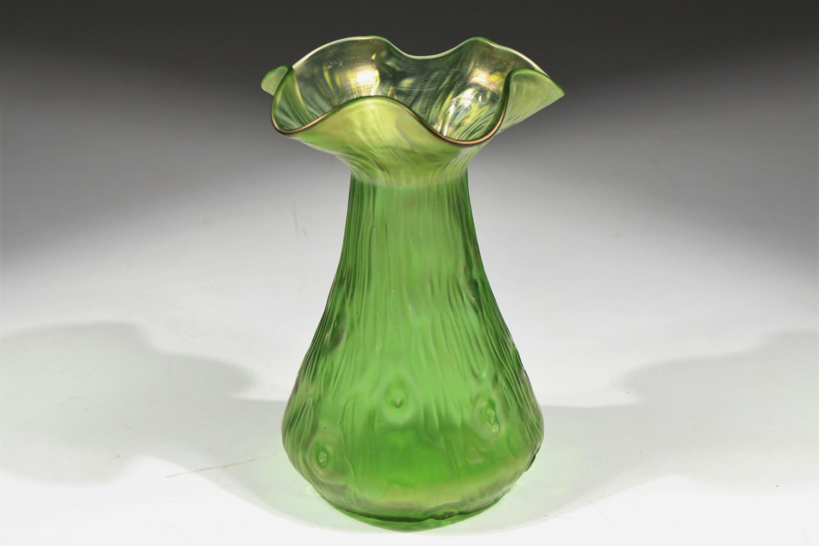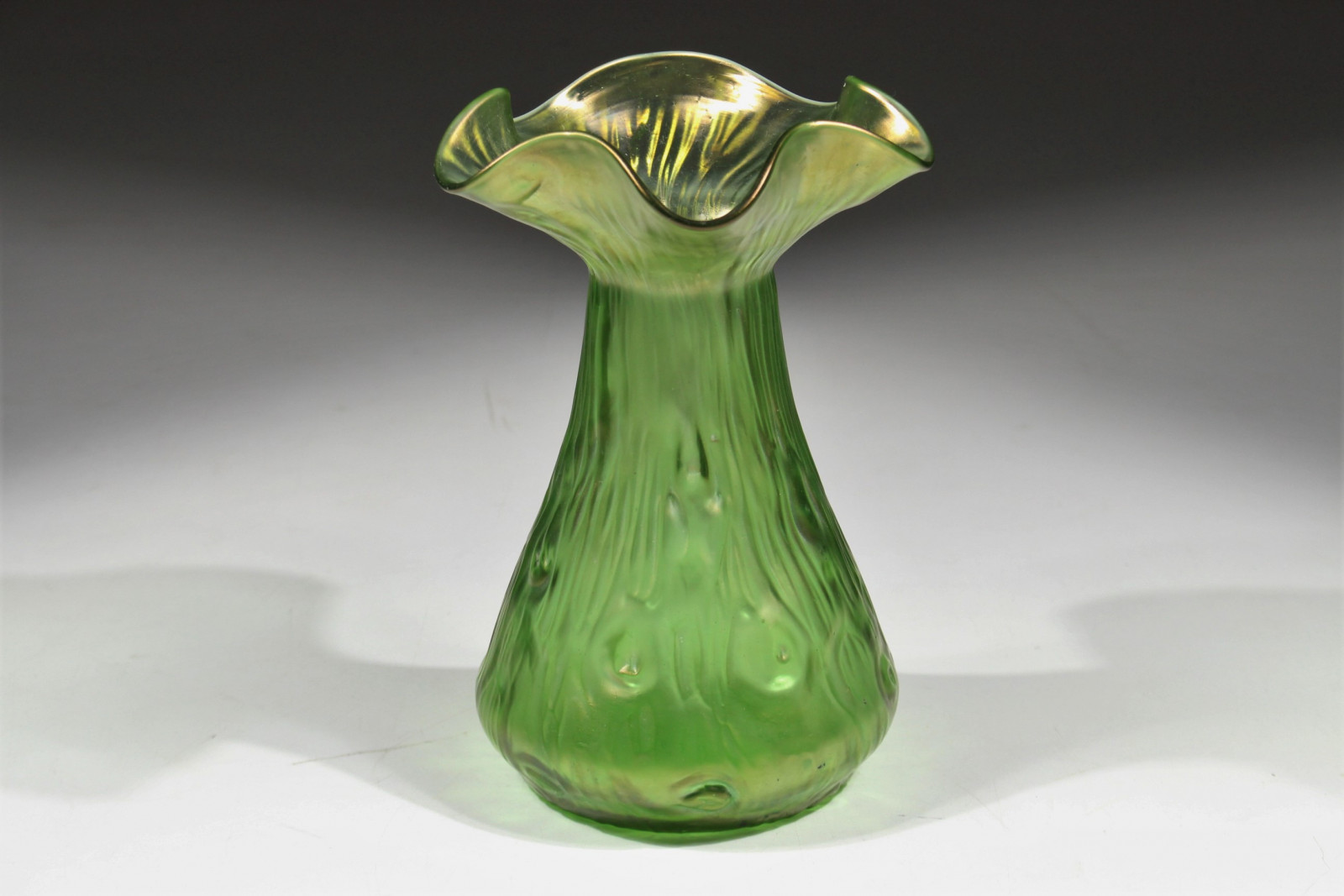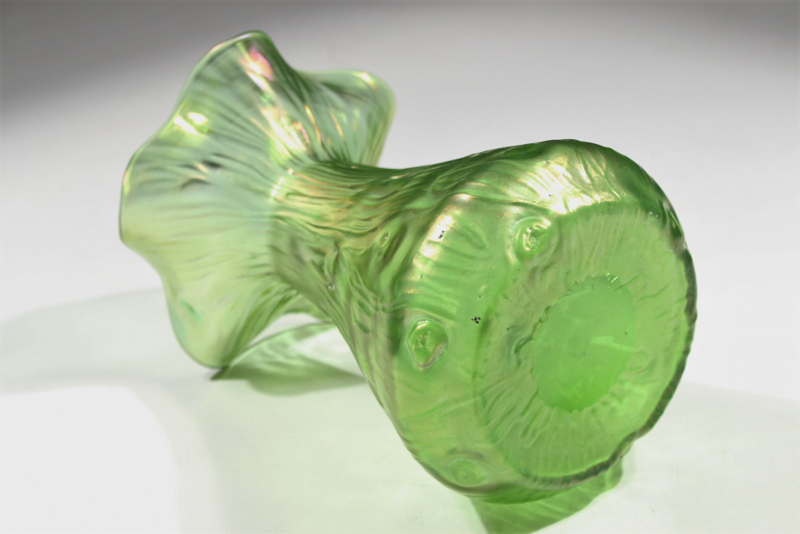 Schöne Jugendstilvase aus grünem, leicht irisierendem Glas und in Blütenkelchform.