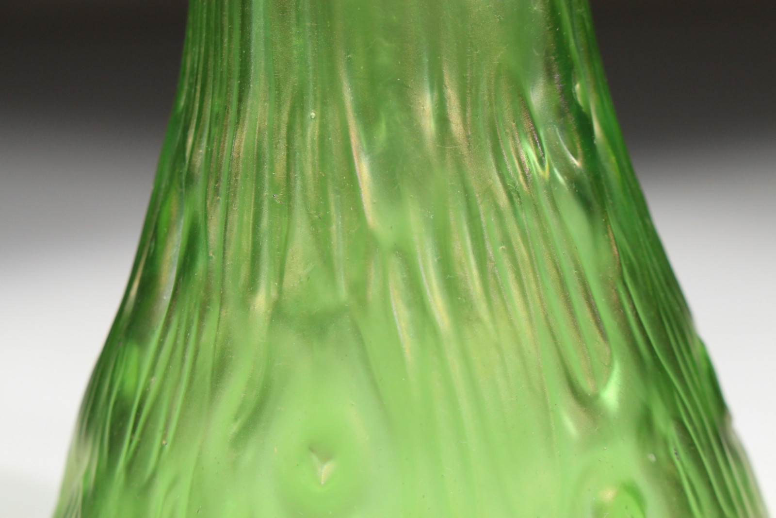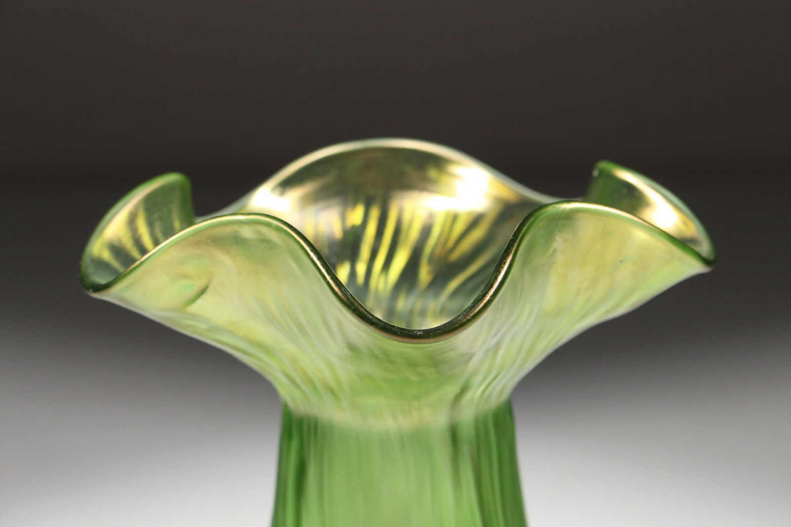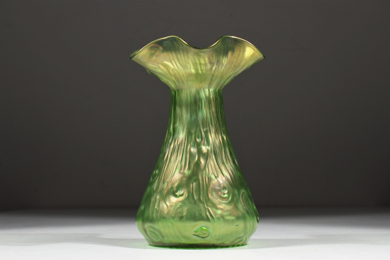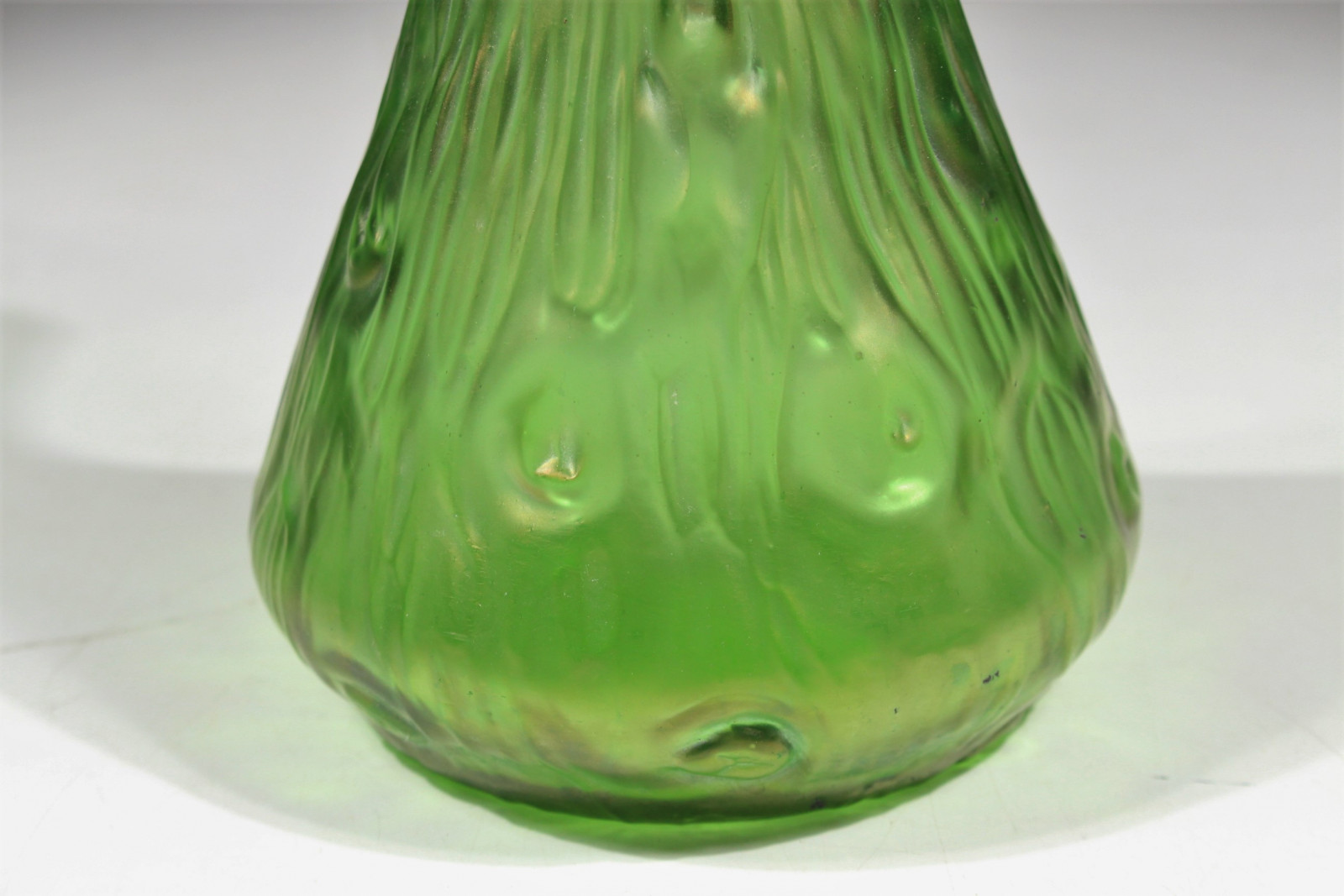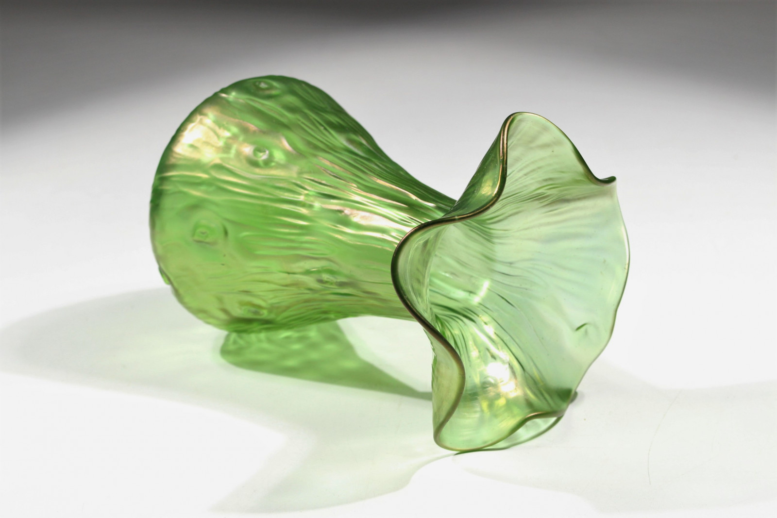 Schöne Jugendstilvase aus grünem, leicht irisierendem Glas und in Blütenkelchform.