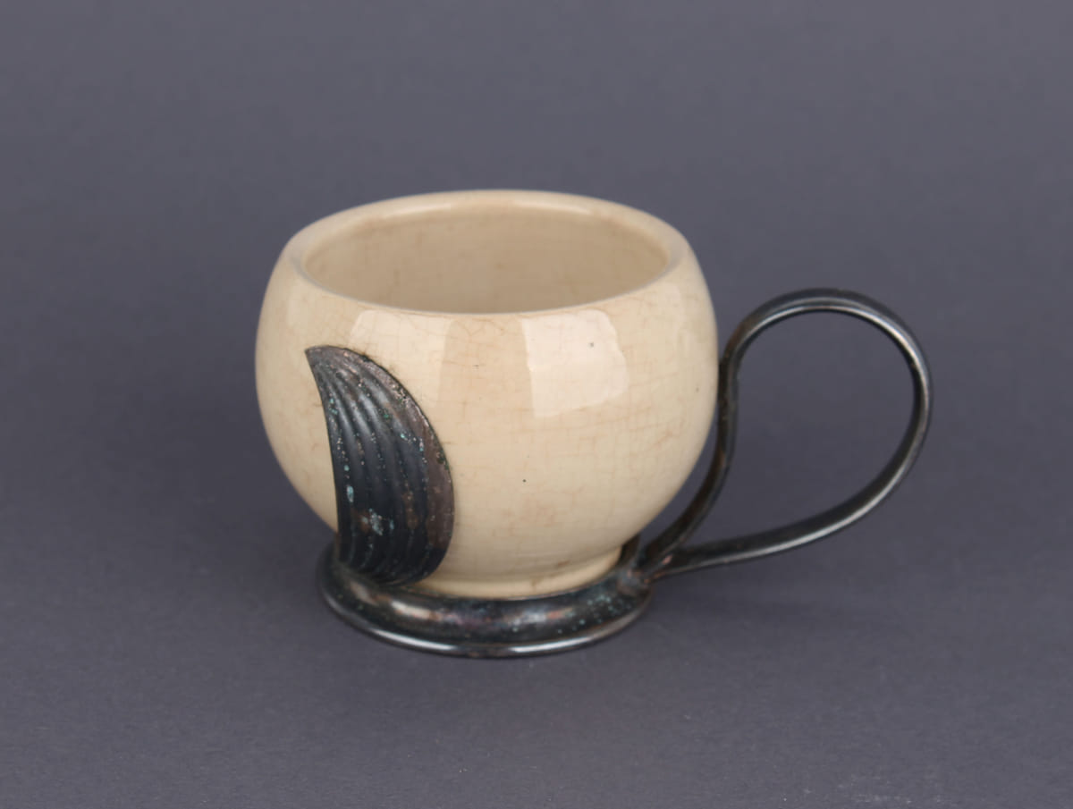 Beige Keramik, Prägestempel Wächtersbach, Messinghalterung mit Silberauflage, gestempelt WMF.Höhe: 5 cmGebrauchsspuren, craqueliert, die Halterung ist leicht oxidiert.