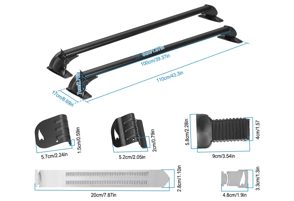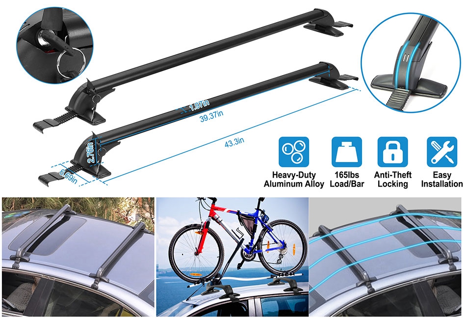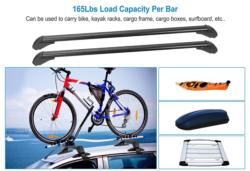 2PCS Universal 110cm/43-inch Car Roof Rack Cross Bar w/ Anti-Theft Lock Product Detail Image GalleryProduct DescriptionOverview:Made from high-strength aluminum alloy materials, our cross bar can withstand severe weather and can bear almost165lbs weight objects per cross bar. At the ends of the cross bar adopt curved shape design to effectively decrease wind noise and resistance and each across bar comes with an anti-theft lock to ensure the security of the cross bar. Additionally, it can be easily mounted on most vehicles which the distance between the rain grooves is between 42.91in-44.88in to carry bike, kayak racks, cargo frame, cargo boxes, snowboard, surfboard, etc. Features:- *165LBS LOAD CAPACITY PER BAR:Can be mounted on most vehicles which the distance between the rain grooves is between 109cm-114cm/42.91in-44.88in to carry bike,kayak racks,cargo frame,cargo boxes,snowboard,surfboard,etc.