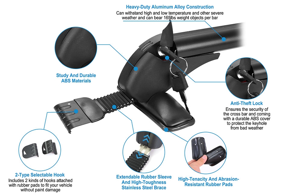 - * CONSIDERATE ANTI-THEFT LOCK DESIGN:Each across bar comes with an anti-theft lock to ensure the security of the cross bar and coming with a durable ABS cover to protect the keyhole from bad weather.