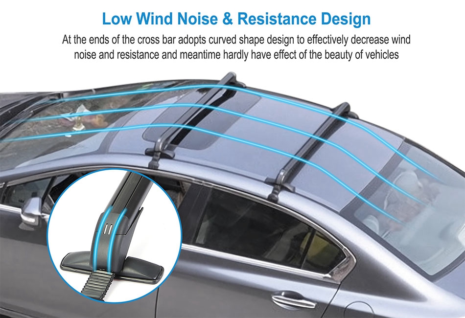 - * LOW WIND NOISE AND RESISTANCE EXTERIOR DESIGN:At the ends of the cross bar adopts curved shape design to effectively decrease wind noise and resistance and meantime hardly have effect of the beauty of vehicles.