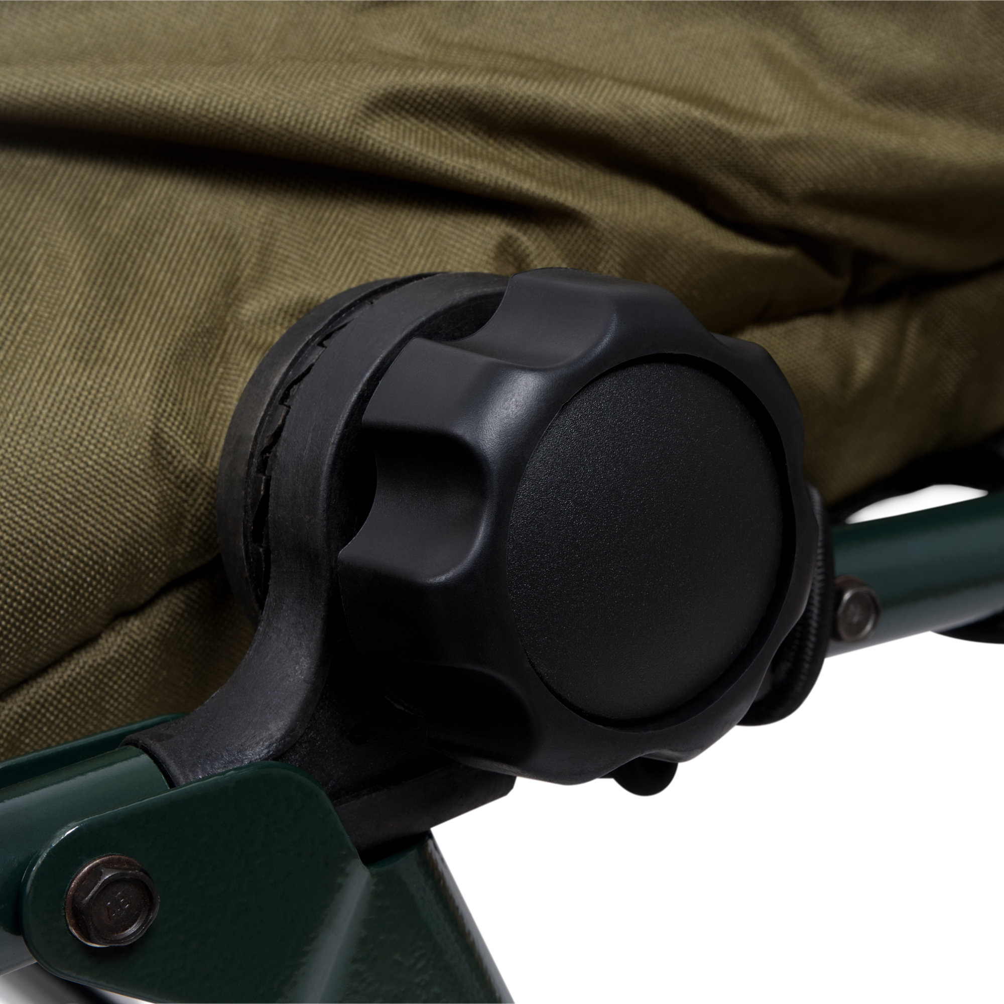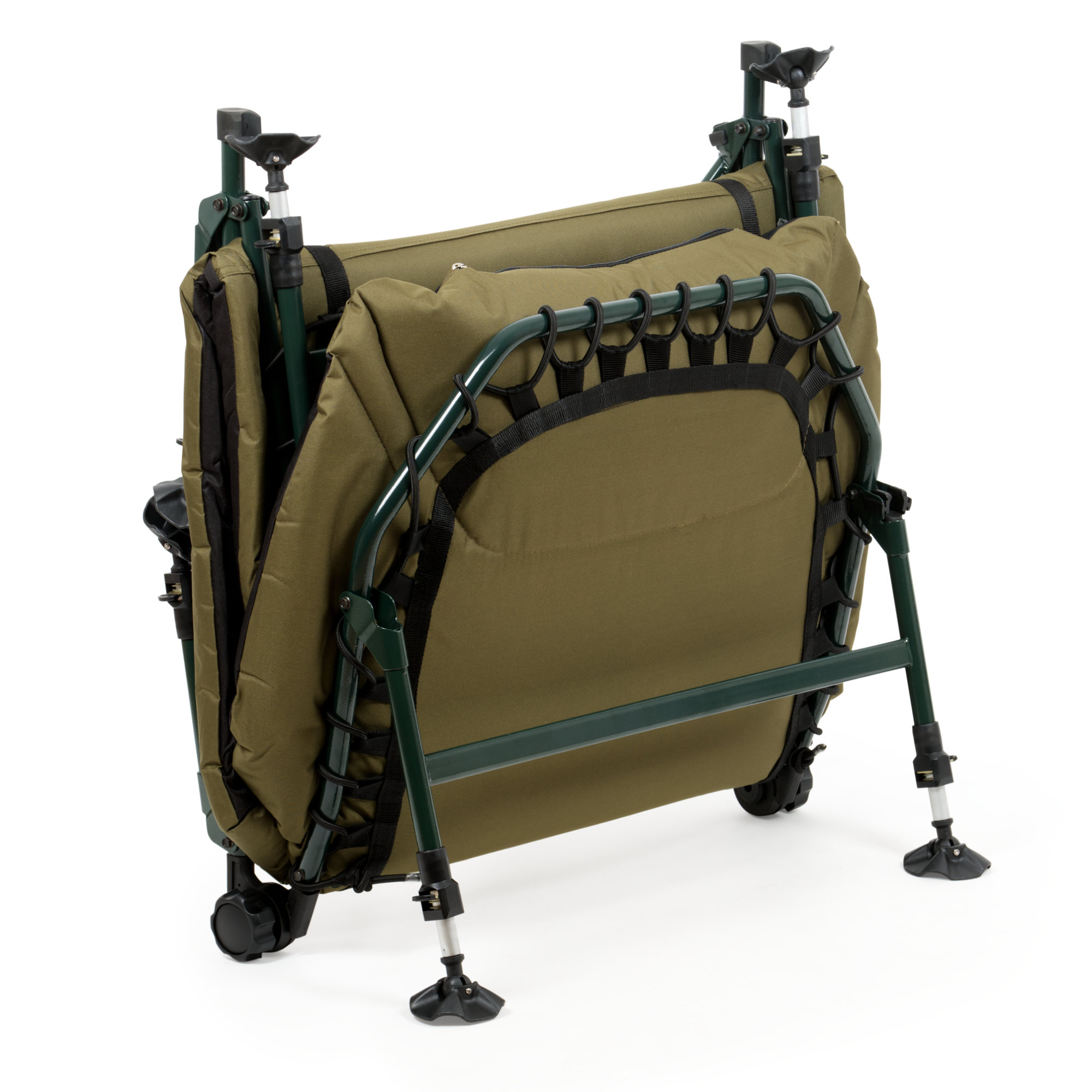 Die Karpfenliege hat einen Metallrahmen, der auch hohe Belastungen problemlos tragen kann. Die 8 höhenverstellbaren Füße verfügen über Schlammteller, die ein Einsinken auf weichem Boden verhindern.