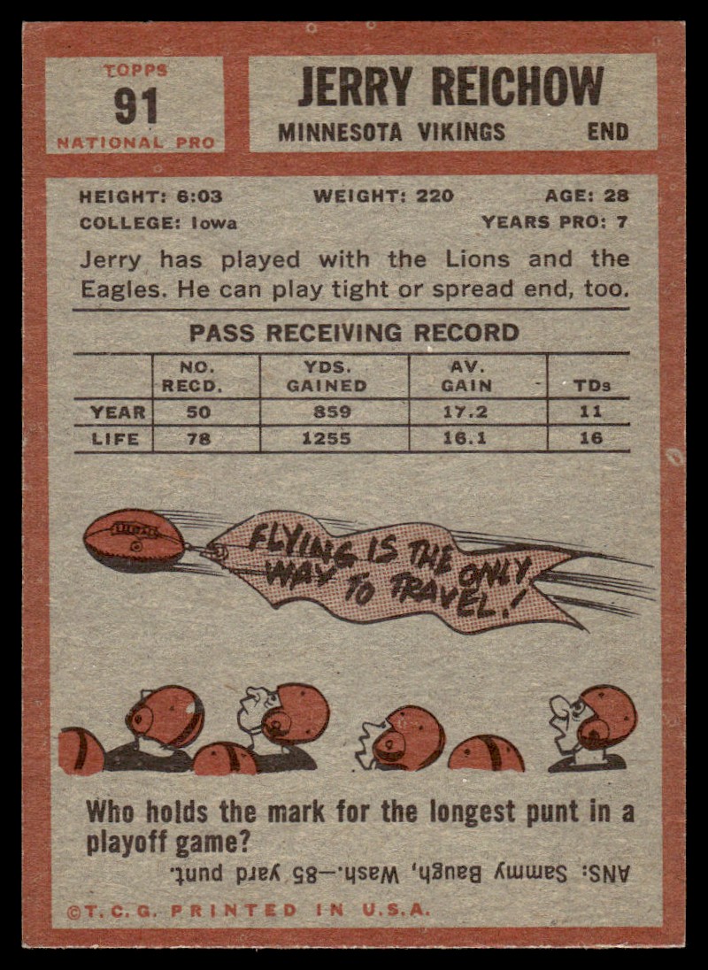 | Description: | Jerry Reichow | | Category: | Football | | Year: | 1962 | | Product: | Topps | | Team: | Minnesota Vikings | | Card Number: | 91 | | Dimensions: | 3¼" x 2½" |