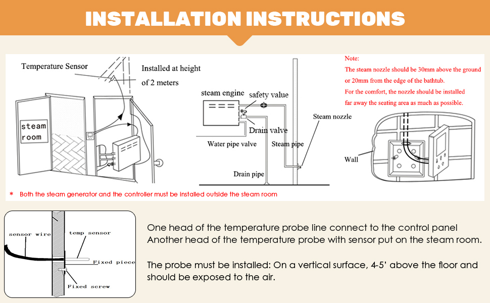 Waterproof intelligent touch controller - Easily adjust temp and working time to your liking of 95 - 131℉and 30 mins-12 hours. Stainless Steel Tanks and Quality Components (Include digital Control,the steam head, and the cable) Ensure Enjoy Years of High Quality Steam in your bathroom and problem free operation. The controller must be installed outside the steam room,if you need install inside the steam room,you can choose ST series 3KW/4.5KW/6KW/7KW/8KW/9KW steam generator