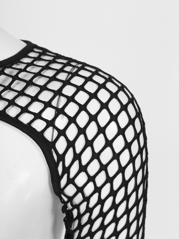 See-through mesh, long sleeves with o rings decoration, mock neck, cropped length.