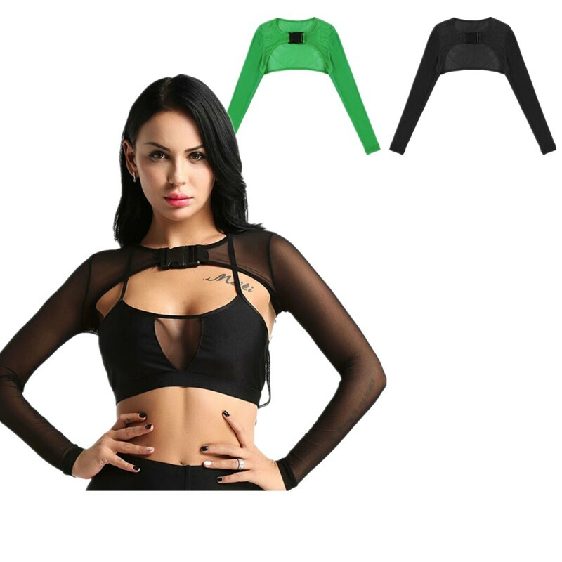Womens O Ring Long Sleeve Sheer Mesh Shrug See-through Mock Neck Crop Top.