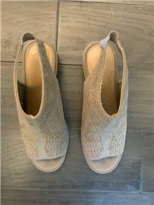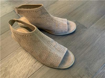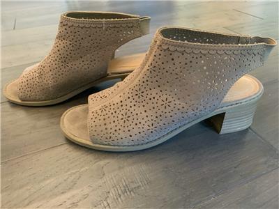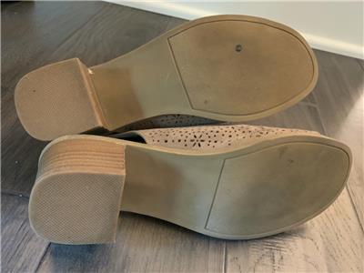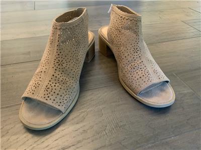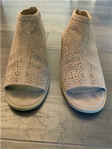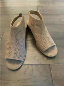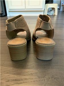 This auction is for a pair of SO Kohl's Girls /Women's Tan Open Toe Stacked Heel Shoes in Size 5 M. They measure 9" on the instep from toe to heel with 2 in. block heel and elastic back for easy slip on and off. They have an artistic geometric cut out on the upper body of the shoe! They are in gently used excellent condition! Please check photos for exact condition.